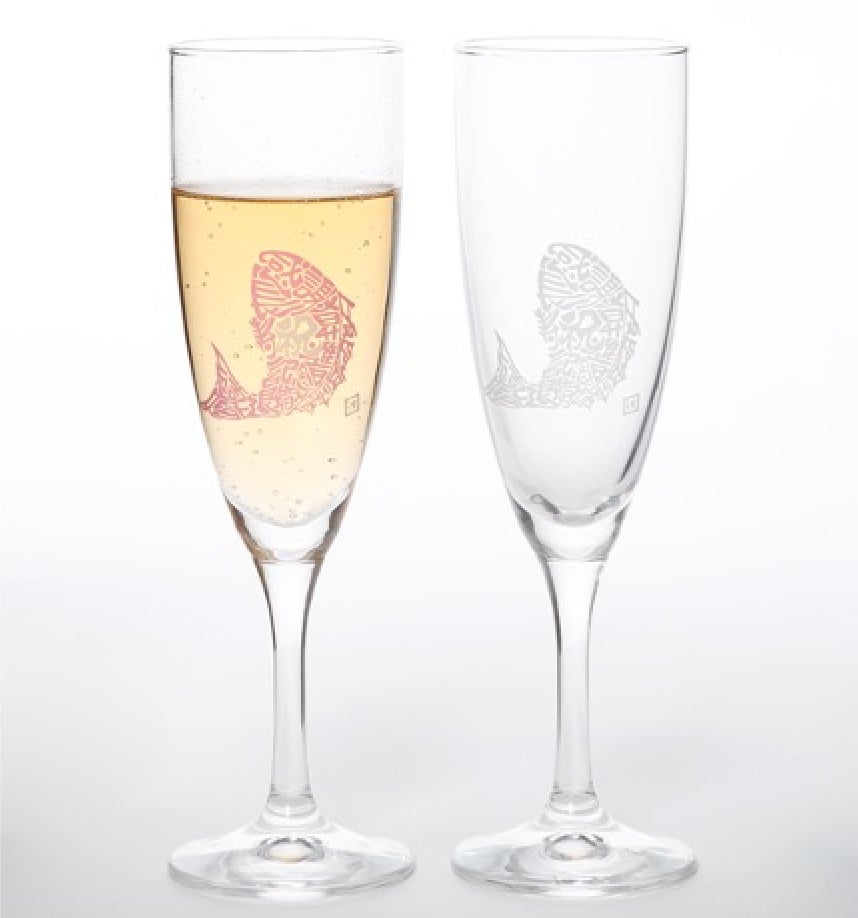 今回は、平盃とシャンパングラスの2種をご用意。およそ17℃以下の冷たい飲み物を注ぐと、鯛やふぐのイラストが鮮やかに変化いたします。