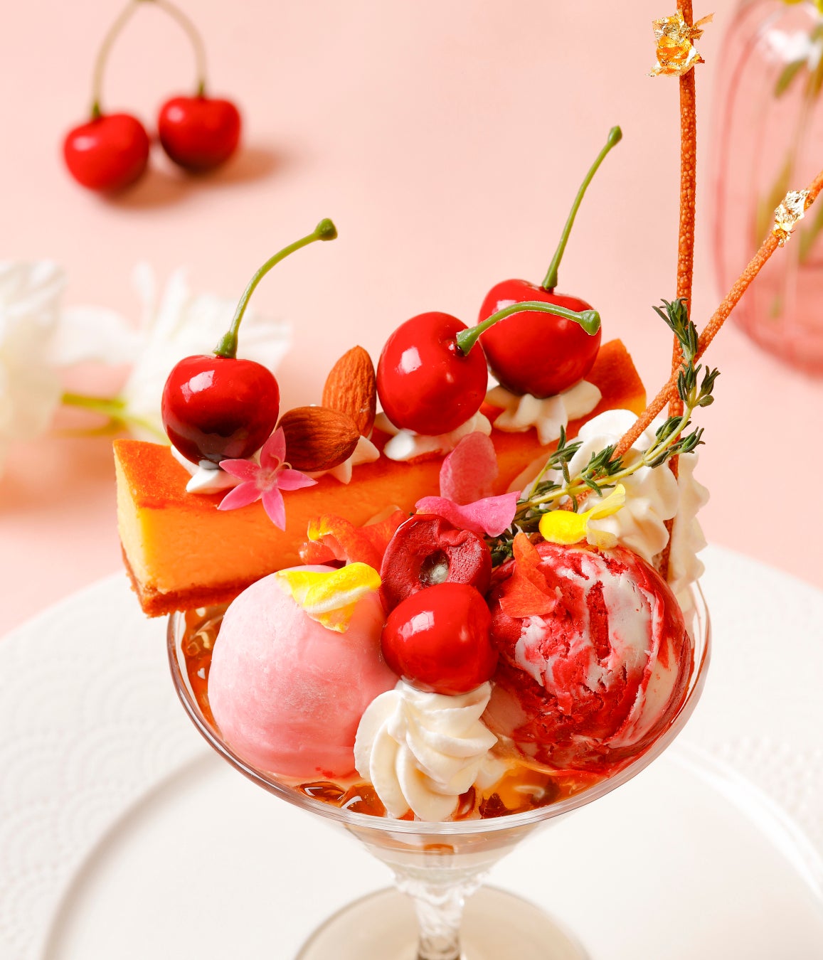 パフェの下層は、ココナッツパンナコッタでほんのり夏らしいテイストに。カットしたジューシーなアメリカンチェリーとネクタリンを重ね、上品な甘みのハチミツカモミールゼリーを合わせました。その上には、ピンク色のさくらんぼシャーベットと、赤と白のマーブル調が美しい組み合わせのカシスシャーベット&ココナッツアイスをのせ、さらに大胆に濃厚なベイクドチーズケーキをオン。パフェの中でアイスもケーキも味わえる、パティシエのユーモラスなアイディアをご堪能いただけます。主役のアメリカンチェリーは、丸ごと4粒トッピング。カラフルなエディブルフラワーやタイム、フライドパスタに金箔をあしらい、エレガントな飾りつけに仕上げました。