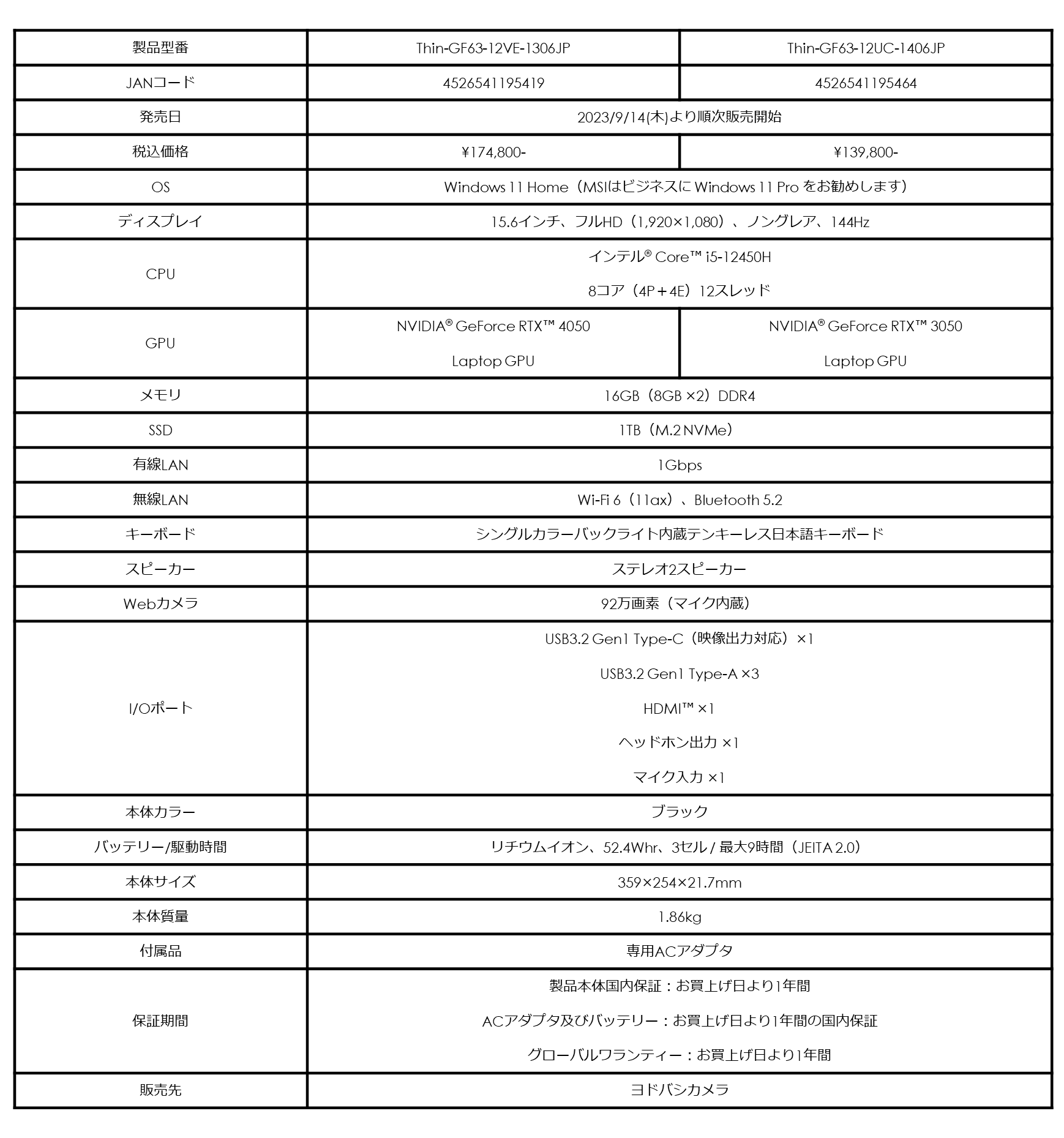 ・Thin GF63 12V シリーズ製品ページ:https://jp.msi.com/Laptop/Thin-GF63-12VX