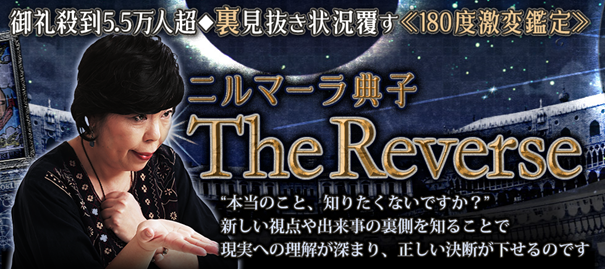 本鑑定「The Reverse」は特別な数秘術とタロットカードを用いて、表から見た性質と裏から見た性質の両方を見ることで、あなた自身が気づいていない本質に踏み込んでいきます。人は誰しも叶えたい夢、何とかしたい問題に日々直面して生きています。自分一人ですぐに解決できるような内容ならばいいのですが、切実な悩みであればあるほど、そう簡単に答えは見つからないもの。ニルマーラ典子による「The Reverse」の鑑定は、そうした様々な悩みを【表側】だけでなく【裏側】からも見抜き本当の答えを下していきます。