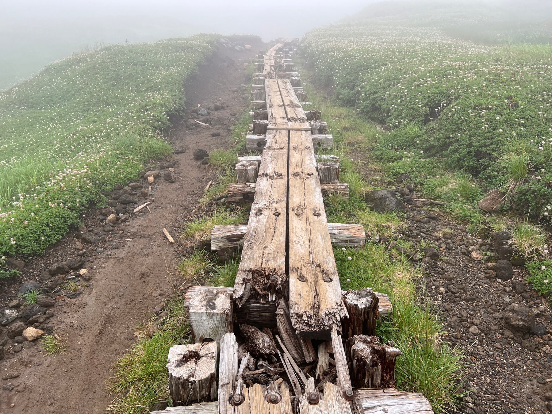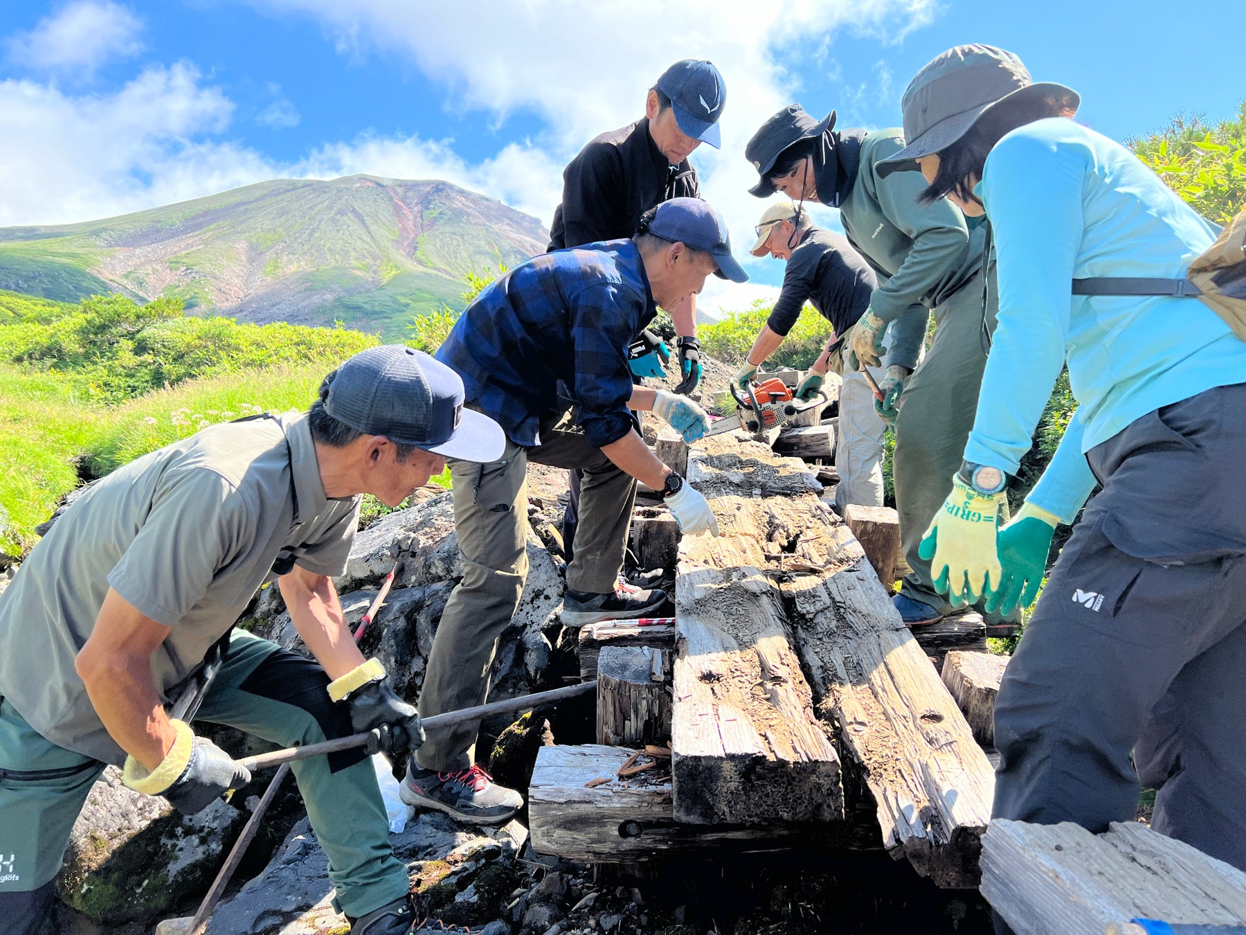2022年から、この裾合平の植生復元のため、登山道の荒廃を止めるため、みんなが参加できる登山道補修イベントを開催し、補修が必要な約600mの木道のうち約500m分を手当できました。今年は新規敷設の場所も含めてあと200mほどの交換で、すべての木道が新しくなります!