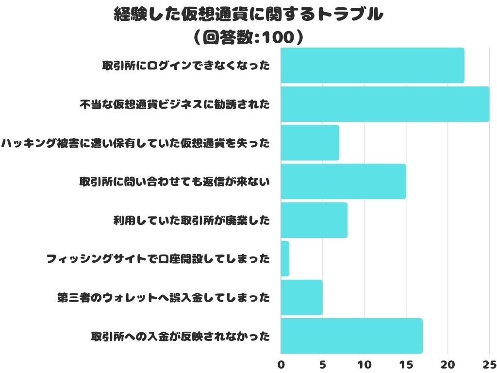2位以降は、「取引所にログインできなくなった」、「取引所への入金が反映されなかった」と続き、「フィッシングサイトで口座開設してしまった」は8位という結果になりました。