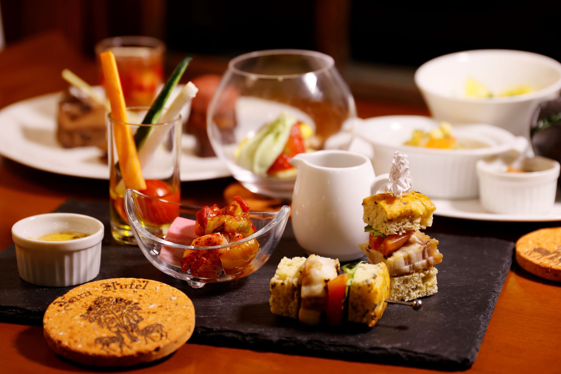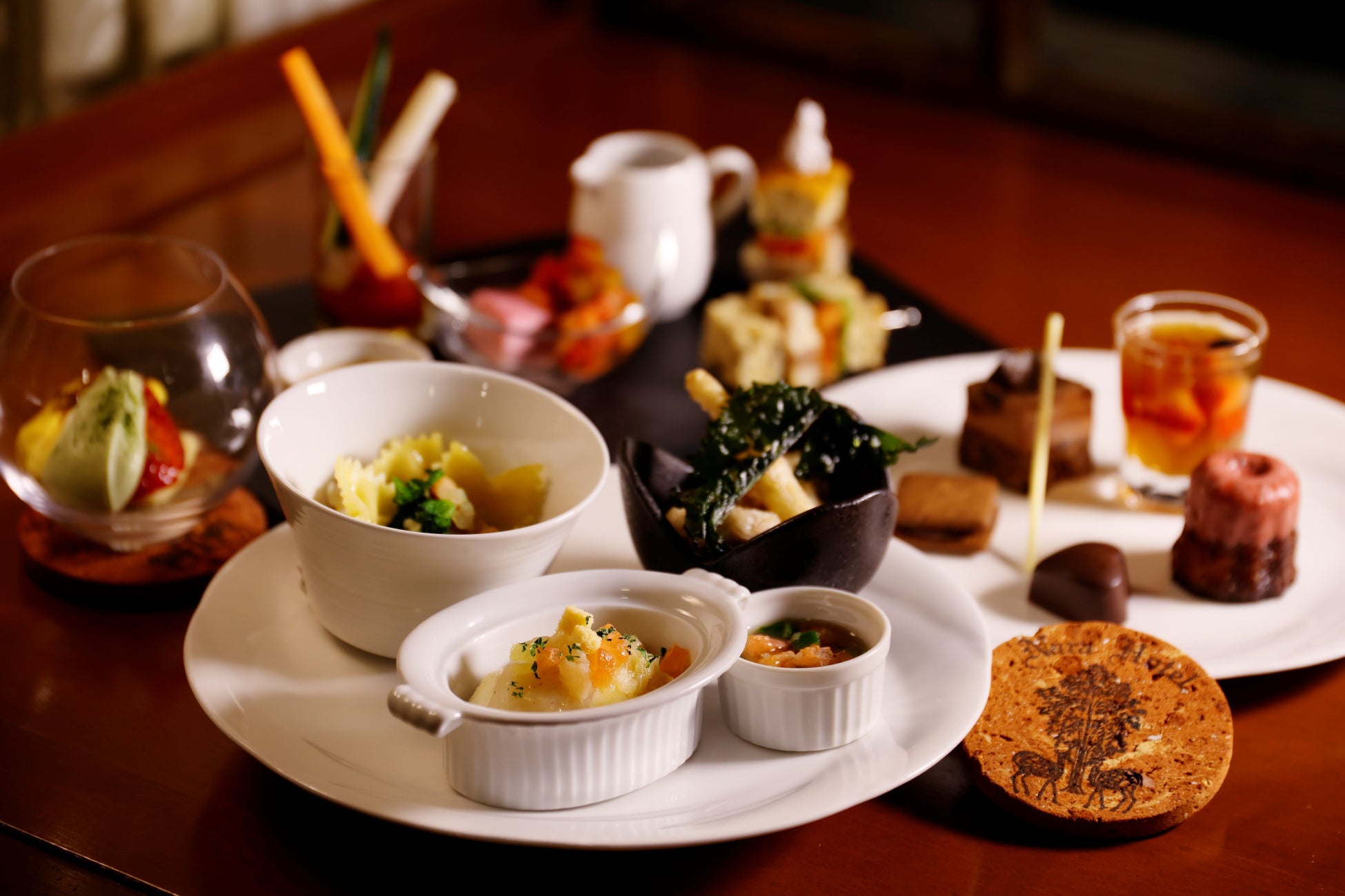 今回のハイティーでは、フードメニューに奈良漬や奈良県産郷ポークなど「奈良らしさ」をプラスし、《古都奈良で過ごすバレンタイン感》を演出いたしました。中でもシェフ渾身の一品は「フォアグラムースと奈良県産いちごチョコと大和茶のザバイオーネ」です。ザバイオーネはイタリアで17世紀頃考案されたといわれている伝統スイーツで、今回は奈良県産いちごと大和茶と共にアレンジし、奈良スタイルに仕上げました。いちごの酸味とフォアグラの食感、大和茶の旨味が上手く合わさり、濃厚で奥深い味わいをお楽しみいただけます。この伝統あるスイーツは、ホテル創業当時の赤煉瓦を加工して制作した煉瓦コースターと共に提供。伝統に伝統を重ねることで、永遠の愛を表現いたします。