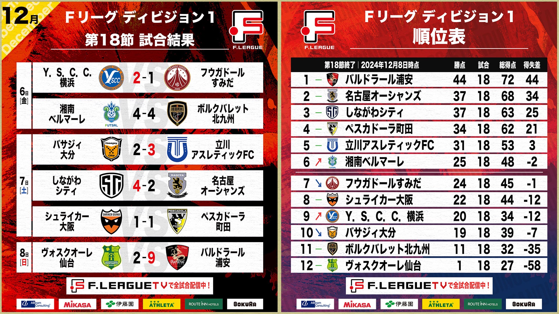 12月6日(金)〜12月8日(日)に実施したFリーグ2024-2025 ディビジョン1 第18節の6試合について結果をお知らせいたします。