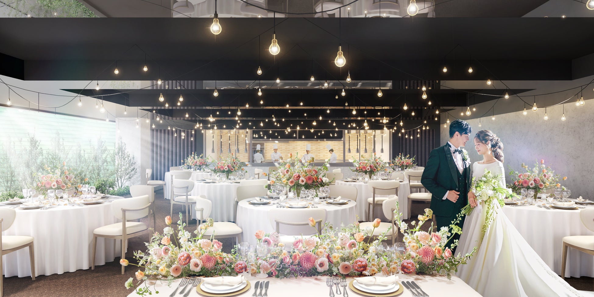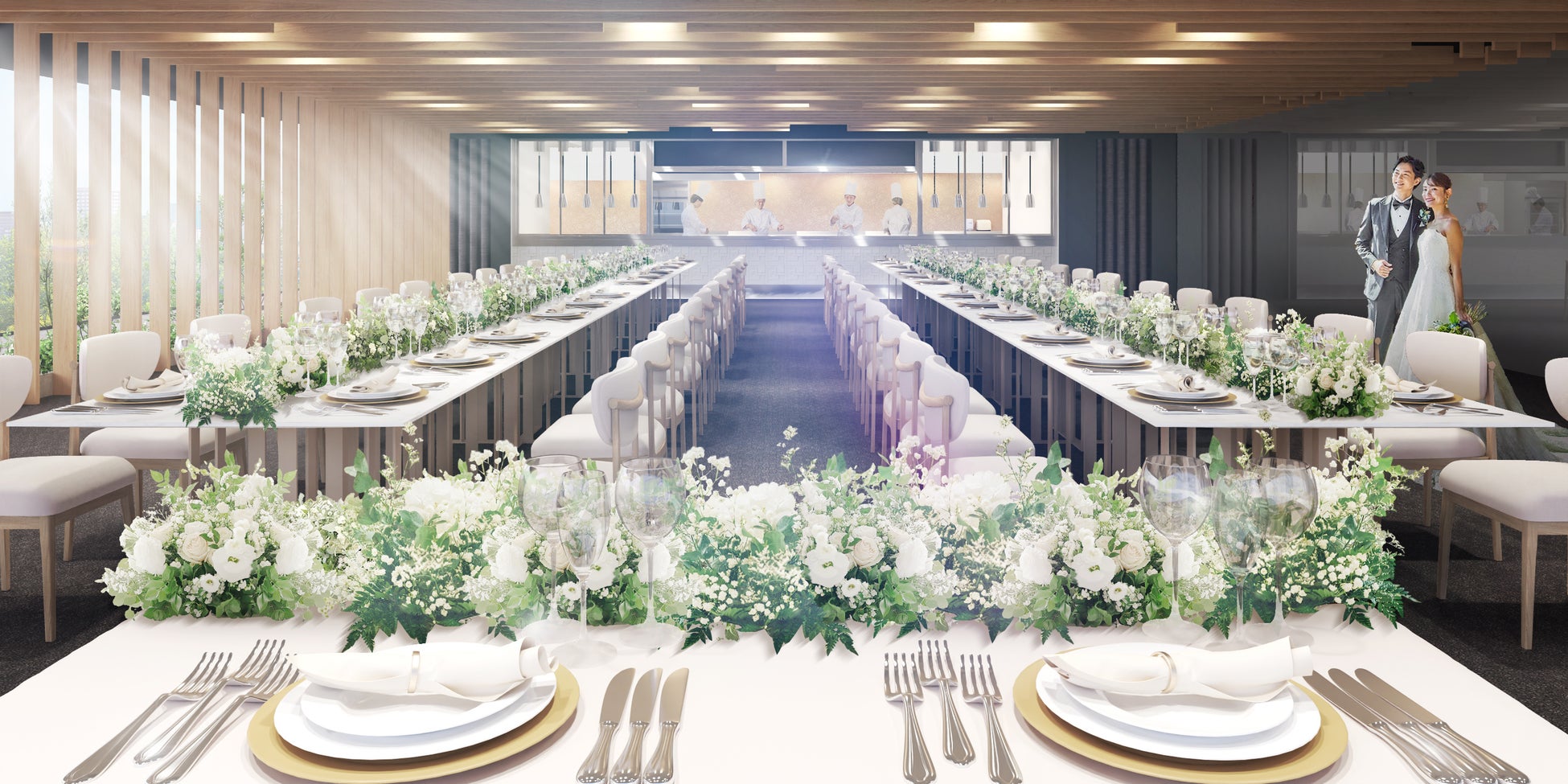 今回のリニューアルでは、従来よりご好評いただいていた“オープンキッチン”を引き続き設置しつつ、それぞれの会場に新たなテーマを導入。「あおば」は日本の伝統的な美意識を感じられる「縁側」をモチーフに、穏やかで落ち着いた空間へと生まれ変わります。