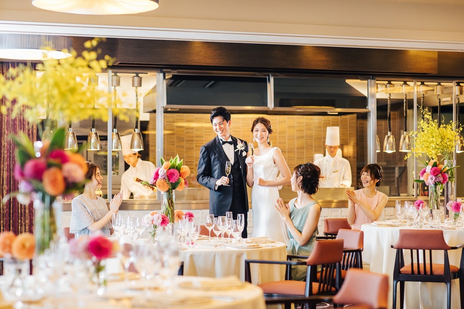 ライブ感あふれるオープンキッチンでは、できたてのお料理とともに、ゲスト一人ひとりの記憶に残る体験をご提供。シンプルでありながら遊び心を感じさせる演出が、おふたりの個性を自然に引き立てます。