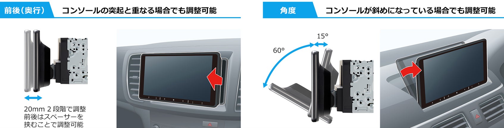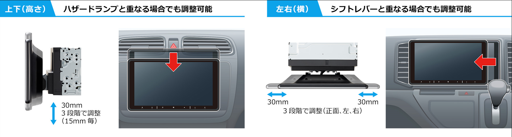 ・フローティングモデル(AVIC-RF920-DC/-RF720)のモニター部は、上下・左右・前後・角度と幅広い可動範囲を持つ機構により、さまざまな車両※への取り付けが可能