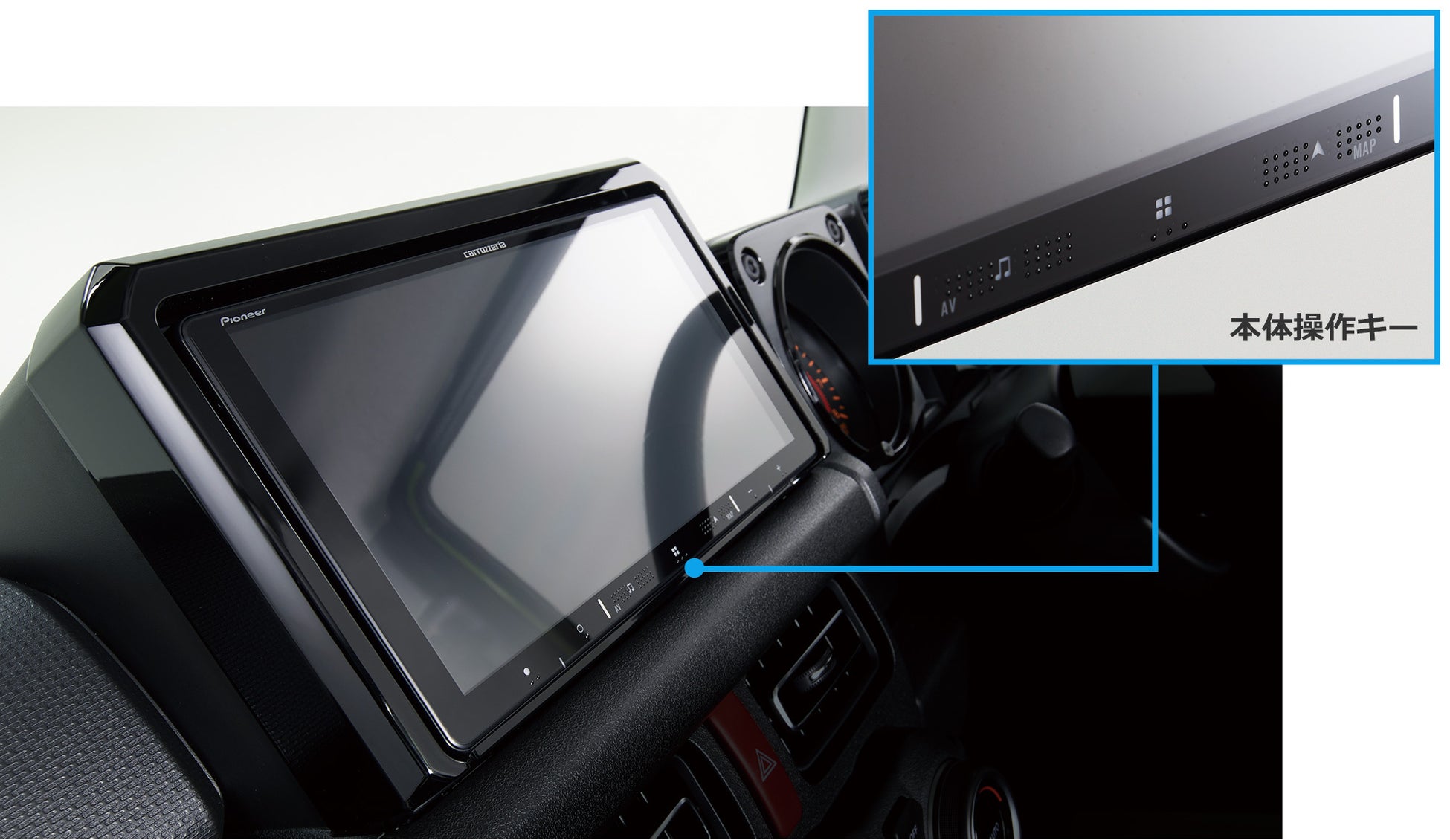 ・車室内のコンソールに溶け込み先進性を感じさせるフルフラットデザインを採用。本体操作キー部分には異なるドットをあしらい、デザイン性と指先で違いを感じられる直感的な操作性を両立。
