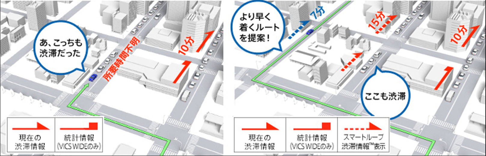 ・長年蓄積してきた膨大な渋滞予測データやリアルタイムの走行・交通情報を分析し、ドライバーに最適な情報を提供する「スマートループ渋滞情報TM」に対応※2。