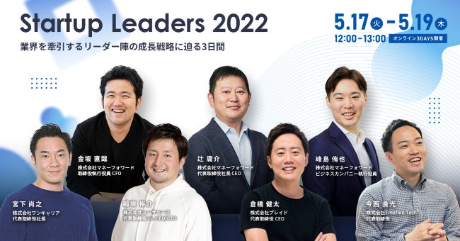 株式会社マネーフォワードは、2022年5月17日(火)~19日(木)に、スタートアップ、ベンチャー企業の経営者やCXOに向けたイベント「Startup Leaders 2022」をオンライン開催します。