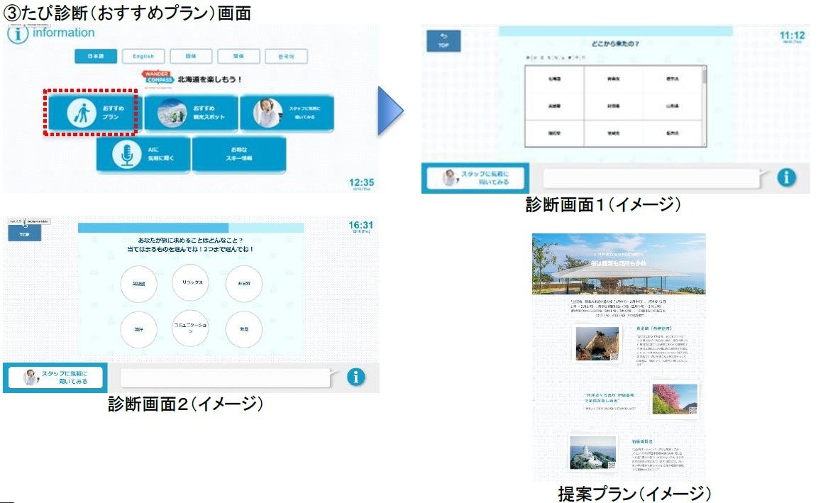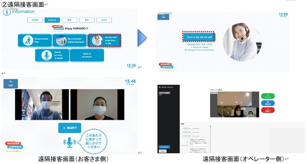 「WANDER COMPASS SHIBUYA」では本サービスの「たび診断」機能により、潜在的な顧客ニーズを把握しつつ、詳細な情報は新千歳空港外国人観光案内所のスタッフがリモートで接客をすることで、ローカルな生きた情報やニーズにあわせた観光提案を実施します。旅行客がこれから訪れる先の案内所スタッフと交流することにより、訪日外国人の満足度向上や行動変容を促せるかどうかの検証を行います。