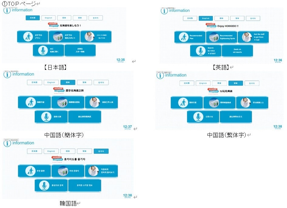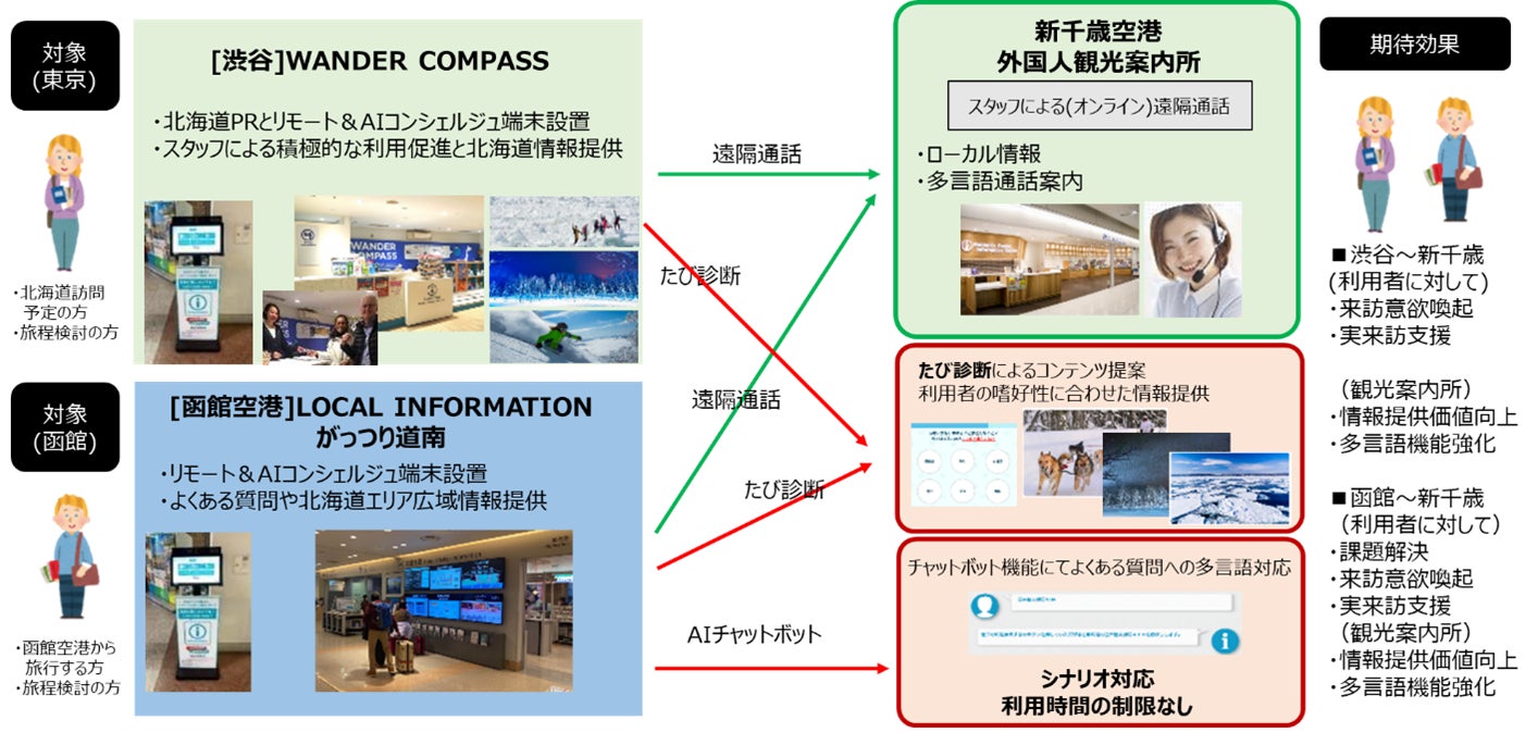 本事業は、訪日外国人が多く訪れる渋谷駅の観光案内所「WANDER COMPASS SHIBUYA」と北海道エアポート株式会社が運営する函館空港の2か所に本サービスを導入したサイネージ端末を設置・活用し、訪日外国人をターゲットに、新千歳空港外国人観光案内所と連携させることで、冬の人気観光地である北海道の情報提供や観光案内を実施します。