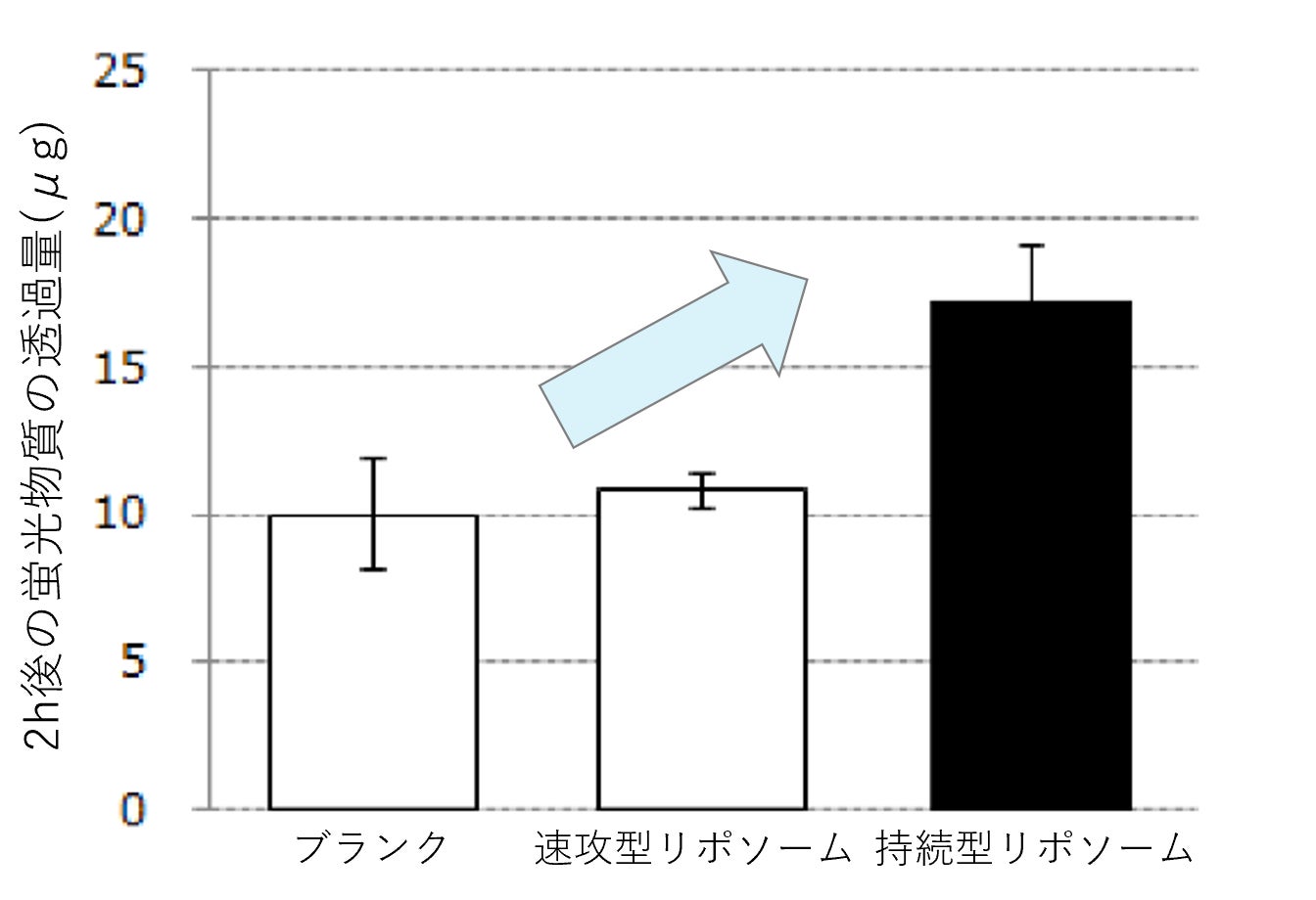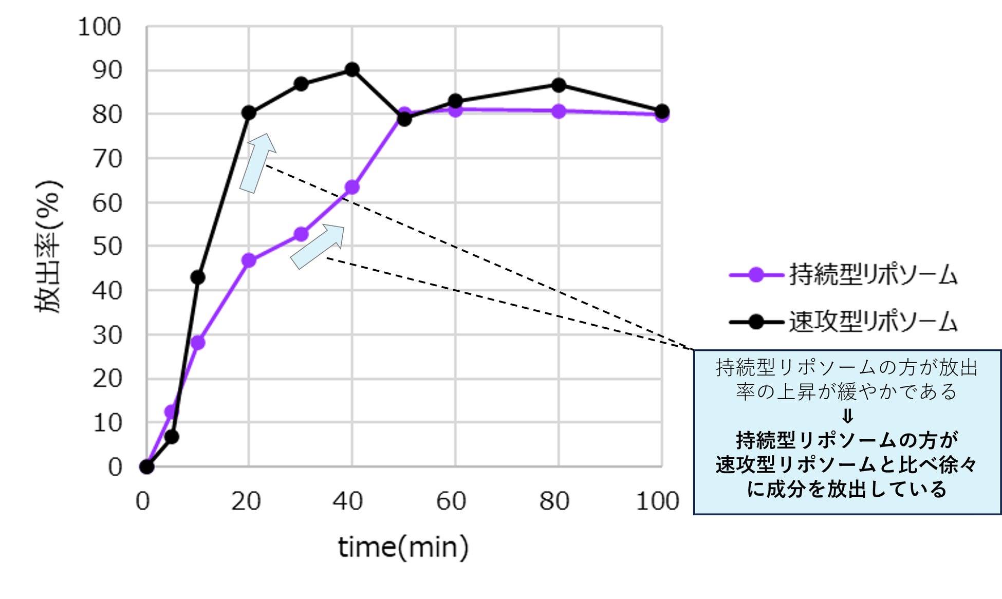 持続型リポソームの徐放性:速攻型リポソームに比べ、成分を徐々に放出します(図4)。
