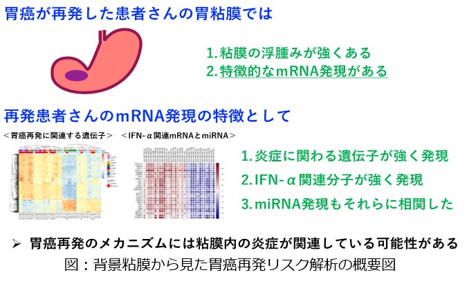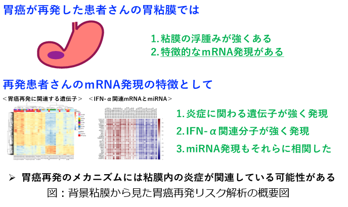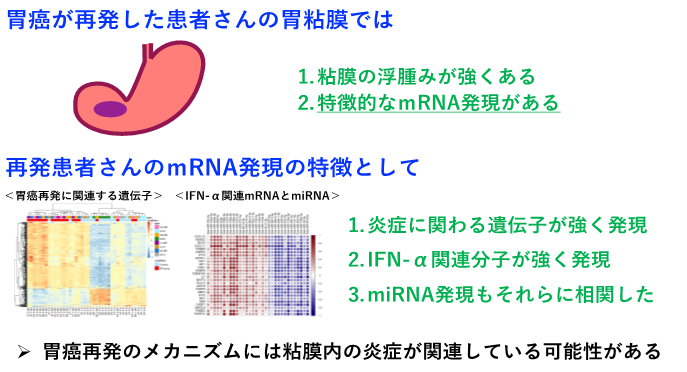 本研究により、再発群はピロリ菌除菌後であっても、内視鏡所見的にも遺伝子発現的にも背景粘膜に炎症像が見られることが示されました。さらにその炎症の制御機構を、IFN-αシグナル伝達経路が担っている可能性が示されました。これにより、胃癌の異所性異時性再発の新たな機構が示されました。