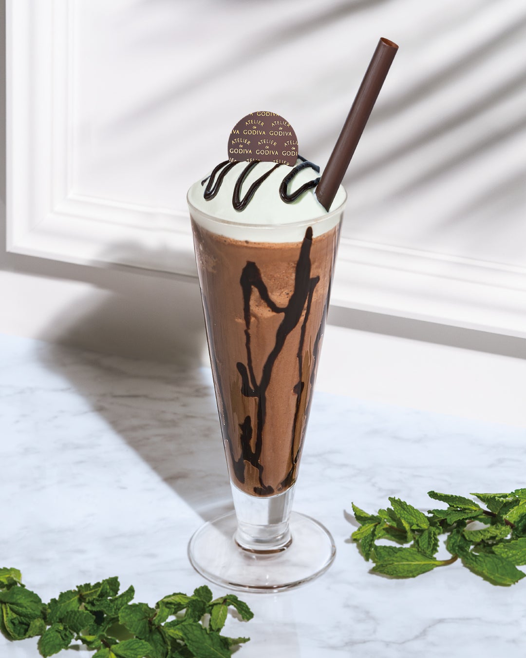 チョコレートミントのスペシャルショコリキサー。砕いて粒状にしたミルクチョコレートを混ぜたショコリキサーに、ミントシロップを加えてすっきりとした味わいに仕上げました。トップにもミント風味のホワイトチョコレートムースをトッピングした、見た目も涼しげで、夏らしいチョコレ―トドリンクです。