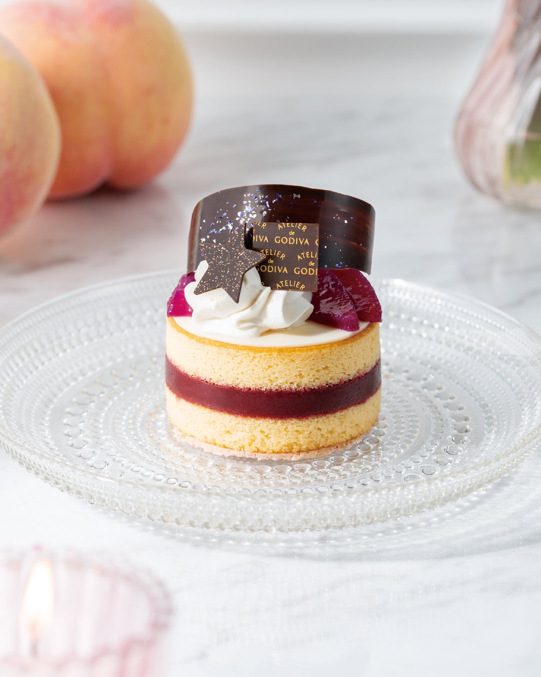 まろやかな口当たりのピーチホワイトチョコレートガナッシュクリームとみずみずしいフルーツの食感に、甘酸っぱいラズベリージュレとチョコレートクランチがアクセントになっています。甘さを抑えた爽やかな味わいのケーキに仕上げました。