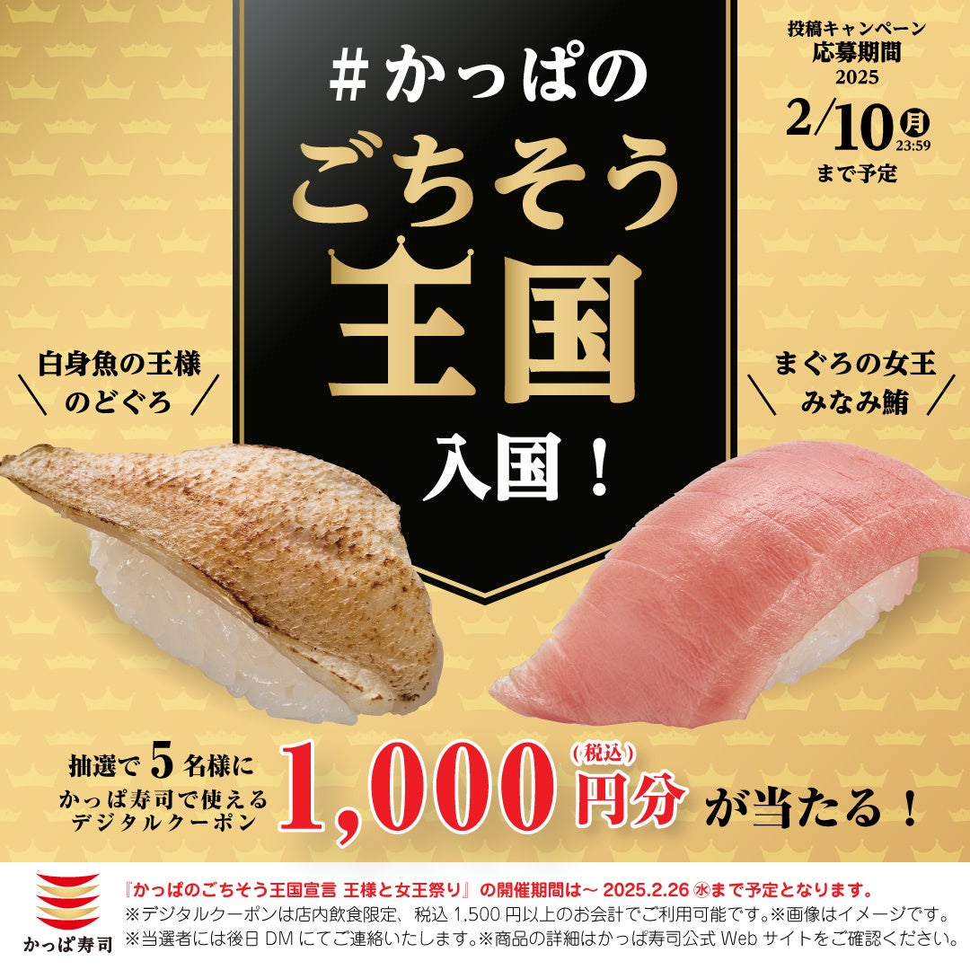 コロワイドグループのかっぱ寿司(カッパ・クリエイト㈱ 本社:神奈川県横浜市、代表取締役社長 山角豪)は、2025年2月6日(木)〜2月26日(水)の期間、『王様と女王祭り』をかっぱ寿司全店にて開催いたします。