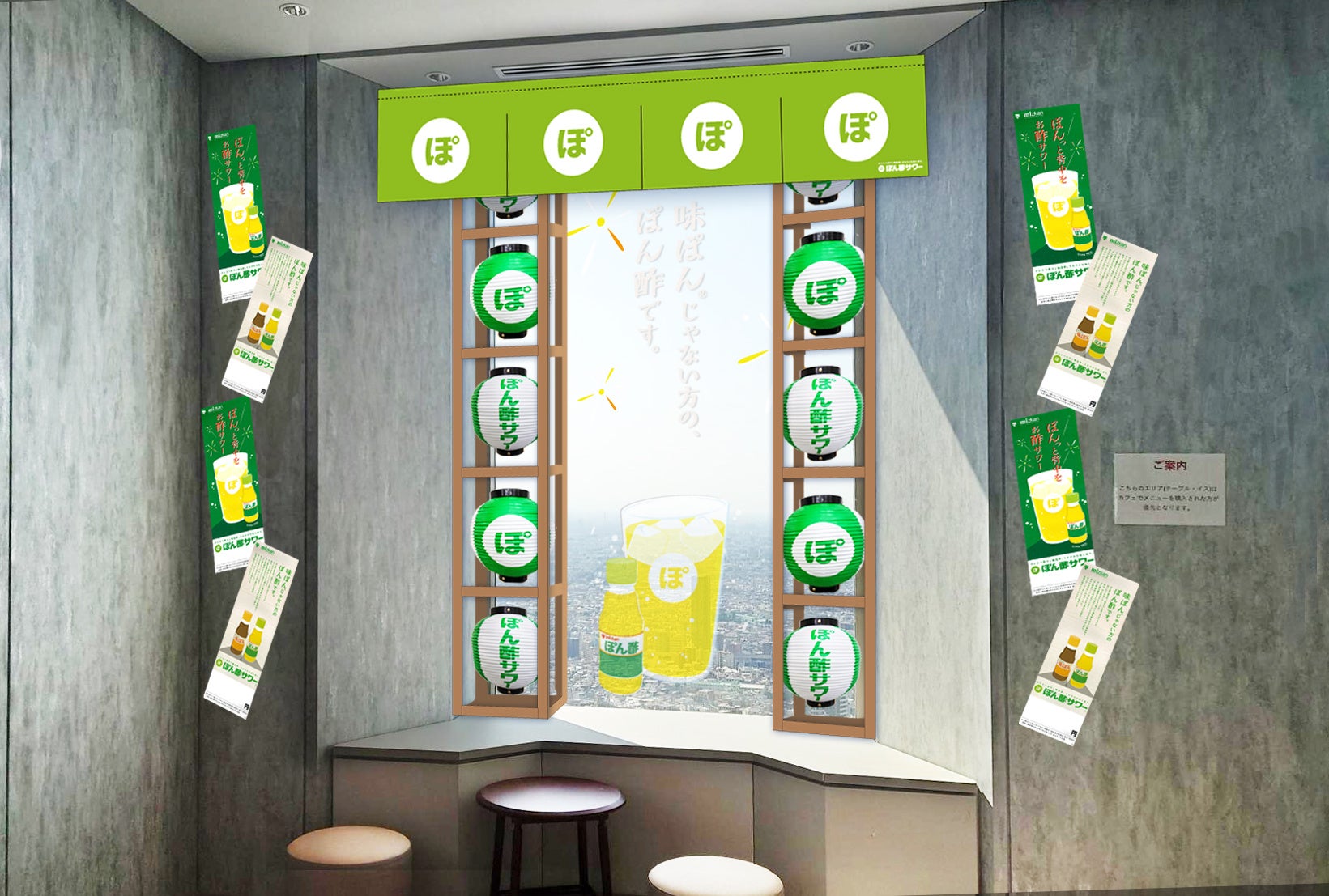 海抜251mからの眺望が映えるフォトスポットを設置。ぽん酢の頭文字「ぽ」をモチーフにした、緑の"まるぽ"デザインの暖簾や提灯など居酒屋をイメージした装飾となっています。