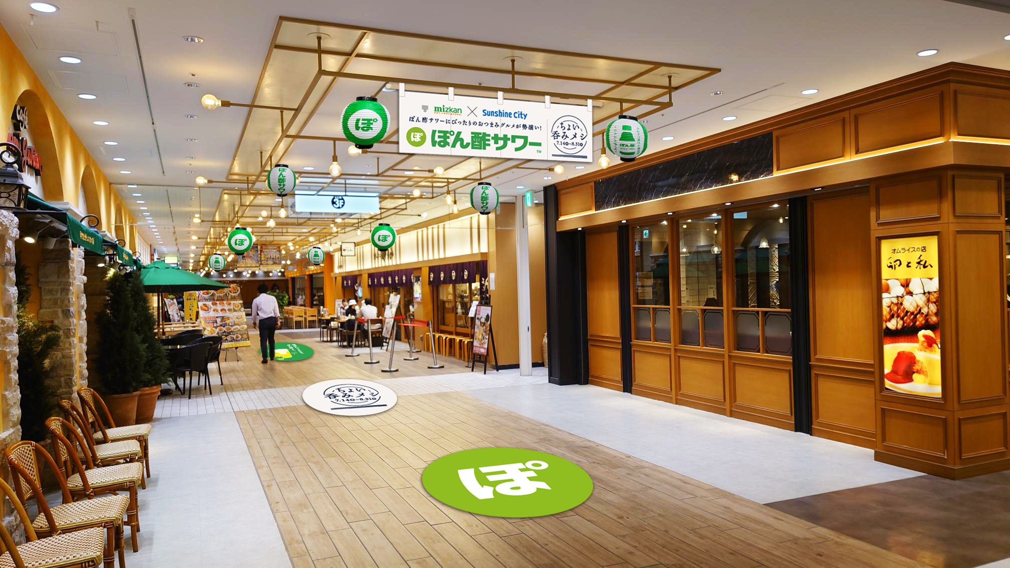 期間中ぽん酢サワーちょい呑みセットをご注文頂いた方を対象に、「ぽん酢サワーグラス」をプレゼントするキャンペーンも実施するほか、専門店街アルパ3F通路にぽん酢の頭文字「ぽ」をモチーフにした、緑の“まるぽ”デザインの提灯や暖簾が登場し、大衆酒場の昭和レトロな雰囲気もお楽しみいただけます。