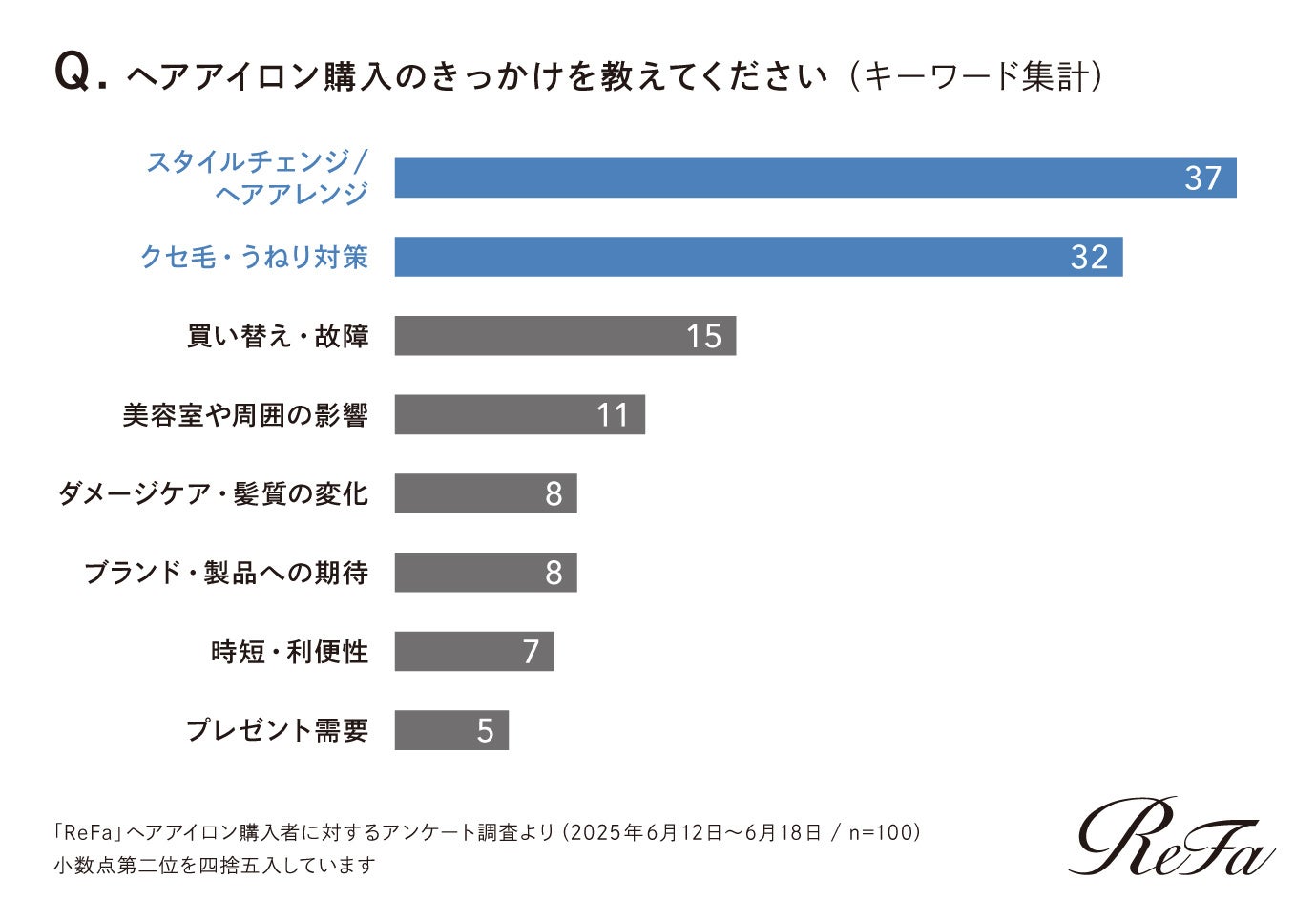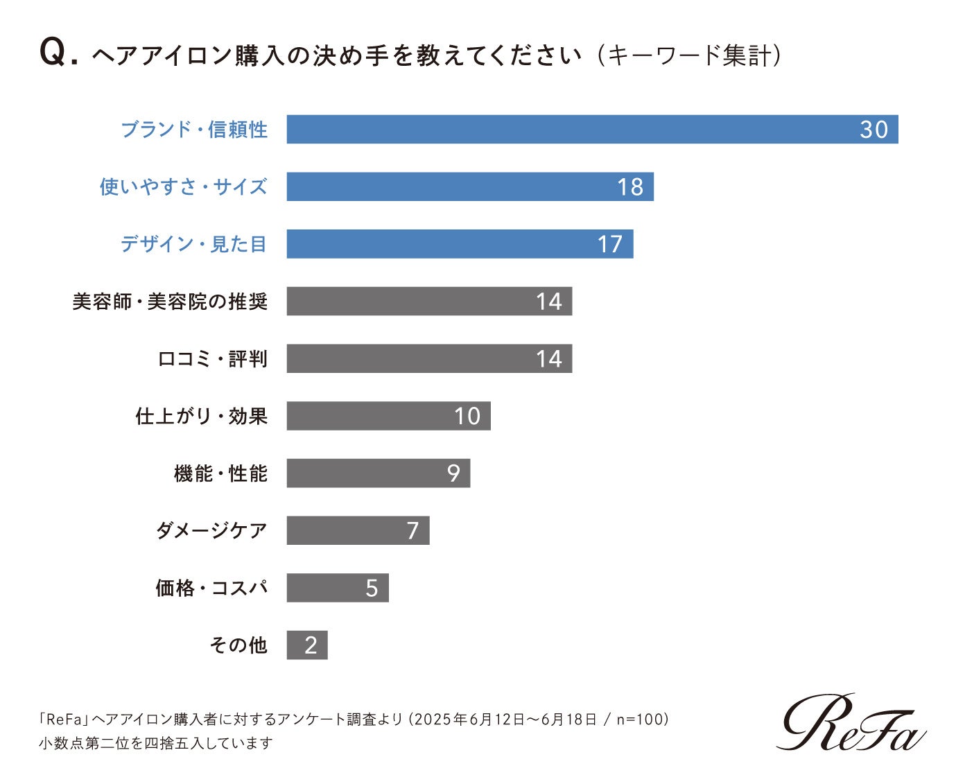 また、「美容師・美容院の推奨」や「口コミ・評判」といった、専門家の推奨や第三者の体験談による信頼も購入を後押しする要因に。そのほか、髪の仕上がりやダメージケア性能、効果実感も確実に購買理由になっており、ReFaのヘアアイロンは、“信頼・使いやすさ・美しさ・効果”のバランスが取れた製品として支持されていることが明らかになりました。