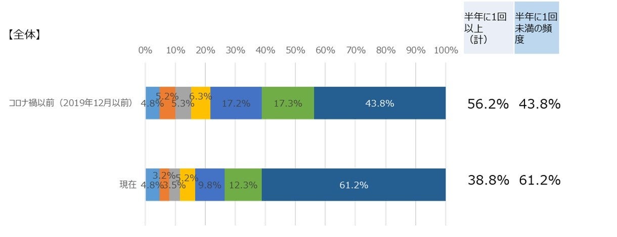 「コロナ禍以前(2019年12月以前)、あなたはどのくらいの頻度で映画やコンサートや舞台などの公演等を見に行っていましたか。また、現在はどのくらいの頻度で見に行っていますか。」と尋ねたところ、全体では、コロナ禍以前は「半年に1回以上」見に行った割合が56.2%、現在では38.8%と17.4ポイントの大きな差がつきました。