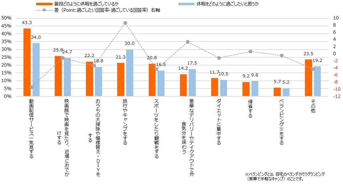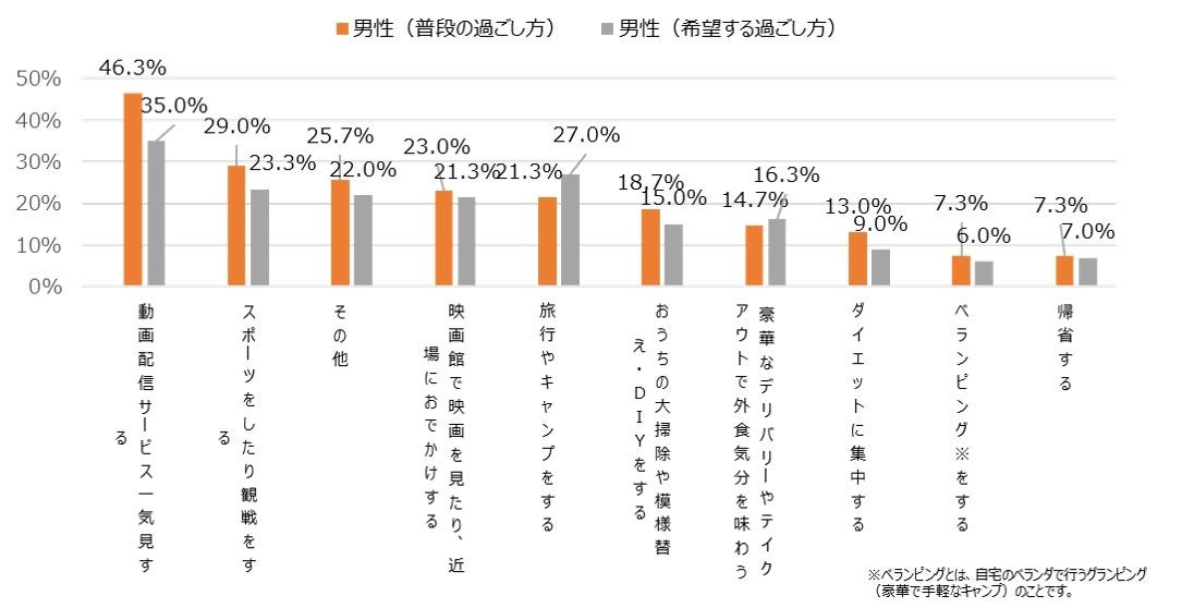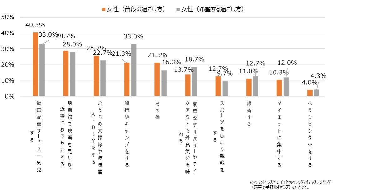 男女別では、普段の休暇の過ごし方について、どちらも1位は「動画配信サービスで一気見する」でしたが、男性は次いで「スポーツをしたり観戦をする」「その他」と続きました。女性は「映画館で映画を見たり、近場におでかけする」「おうちの大掃除や模様替え・DIYをする」となりました。希望する過ごし方については、男女どちらも「動画配信サービスで一気見する」に次いで「旅行やキャンプをする」を希望していることが分かりました。