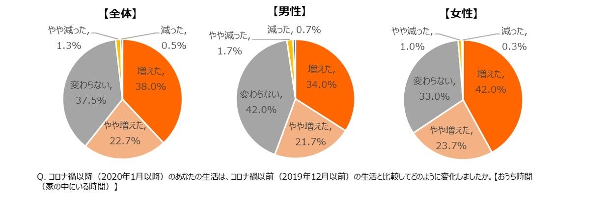 まず、「コロナ禍以降(2020年1月以降)のあなたの生活は、コロナ禍以前(2019年12月以前)の生活と比較してどのように変化しましたか。」と尋ねたところ、“おうち時間(家の中にいる時間)”については、「増えた」と答えた人が全体の38.0%、「やや増えた」も22.7%と、合わせて約6割の人が在宅時間が増えたと回答しました。男女別では、「増えた」「やや増えた」という回答が男性の55.7%、女性は65.7%と女性の方がやや多い結果となりました。
