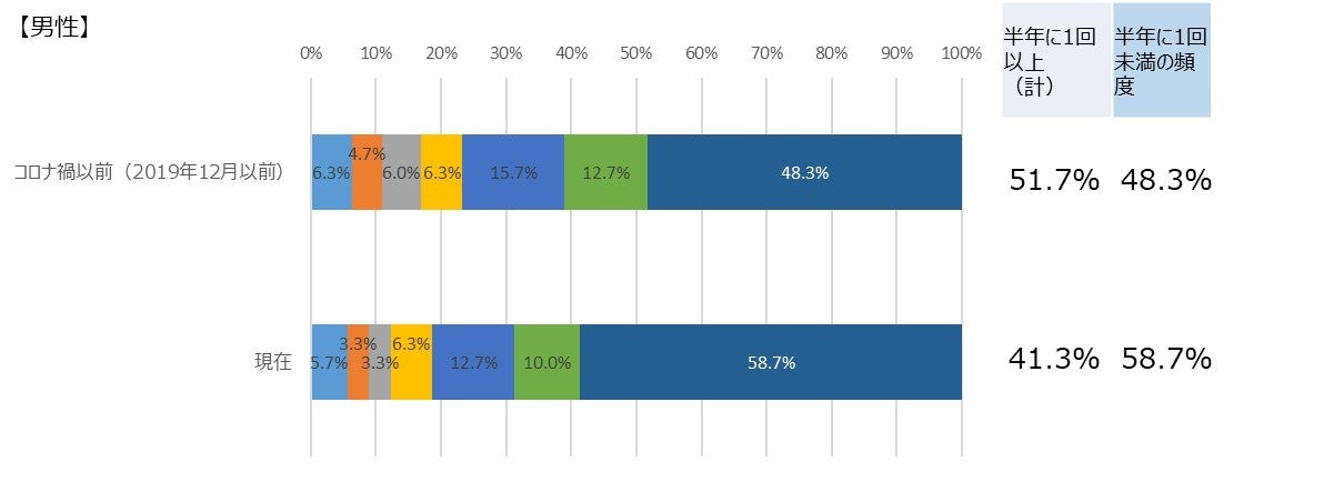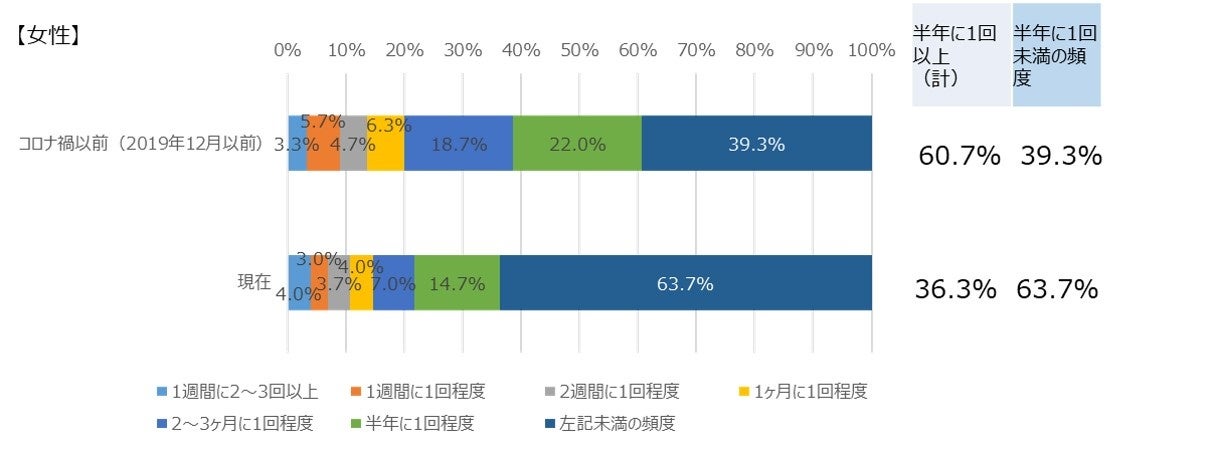 男女別を見ると、コロナ禍以前は「半年に1回以上」見に行った割合が男性51.7%、女性60.7%に対して、現在では男性41.3%、女性36.3%と、特に女性の方が公演に行く割合が減っていることが分かりました。