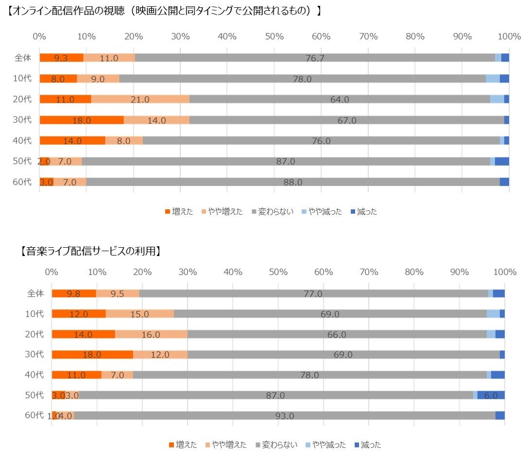 “オンライン配信作品の視聴(映画公開と同タイミングで公開されるもの)”については、全体の9.3%が「増えた」と回答し、「やや増えた」と合わせて20.3%となりました。年代別では20代と30代が他の年代に比べて多く、20代は「増えた」「やや増えた」合わせて32.0%、30代も32.0%という結果になりました。