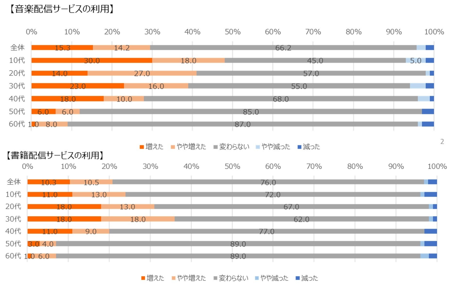 “書籍配信サービスの利用”についても同様で、 「増えた」「やや増えた」合わせて全体の20.8%という結果になりました。年代別で一番多かったのは、 30代の「増えた」「やや増えた」合わせて36.0%でした。