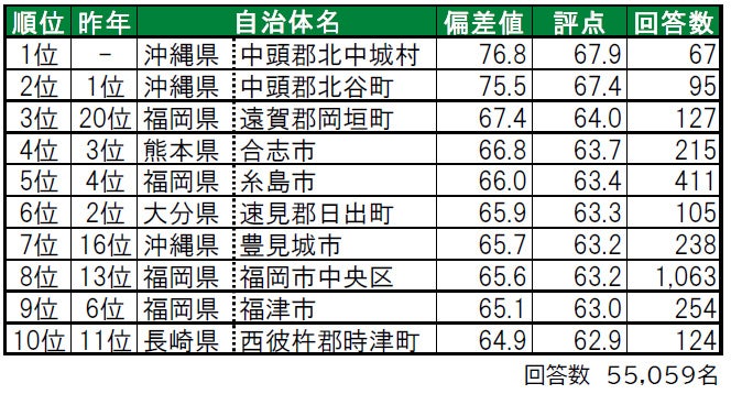 1位は、昨年は累計回答数が50名未満だったためランキング集計対象外だった沖縄県中頭郡北中城村で、「街の幸福度」1位、「街に誇りがある」「街に愛着がある」2位と各ランキングで高い評価を得ています。2位は、沖縄県中頭郡北谷町で、「街に誇りがある」「街に愛着がある」1位、「住みここち」3位と、各ランキングで高評価を得ています。3位は、福岡県遠賀郡岡垣町で、昨年20位から大幅に順位を上げています。