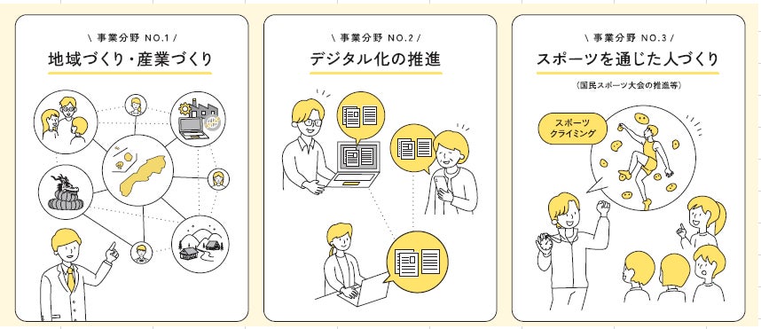 ①この試験では、島根創生計画やアクションプランに基づき、島根県が実施する3つの事業分野(地域づくり・産業づくり/デジタル化の推進/スポーツを通じた人づくり(国民スポーツ大会の推進等))において、即戦力として組織に貢献してくださる方を求めています。