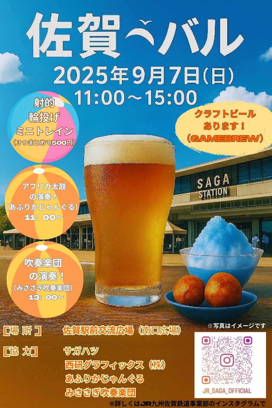 九州旅客鉄道株式会社(以下、JR九州)では日頃よりJR九州をご利用していただいているお客さまに佐賀駅の元気(輝き)や感謝の気持ちをお届けするとともに、地元企業さまと協力することで地域との交流、駅の賑わいを創出することを目的とし、「佐賀バル」を開催いたします。佐賀バルでは、射的や輪投げ、ミニトレイン乗車体験といったイベントやクラフトビールの販売などをご準備しております。