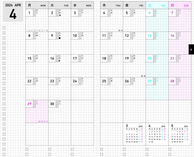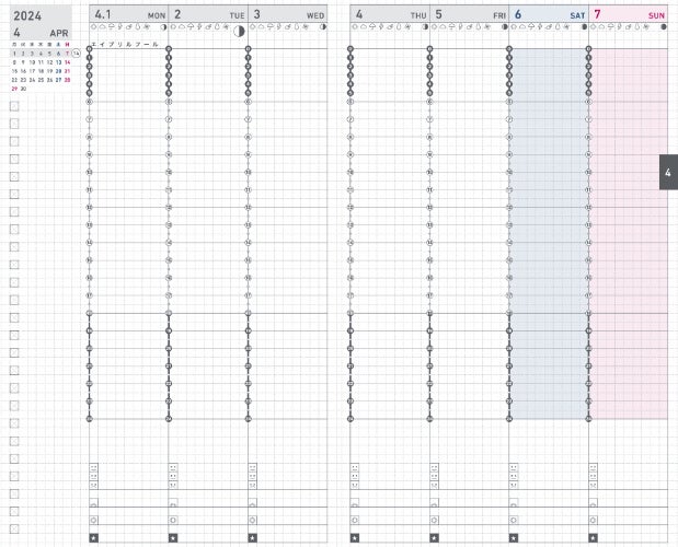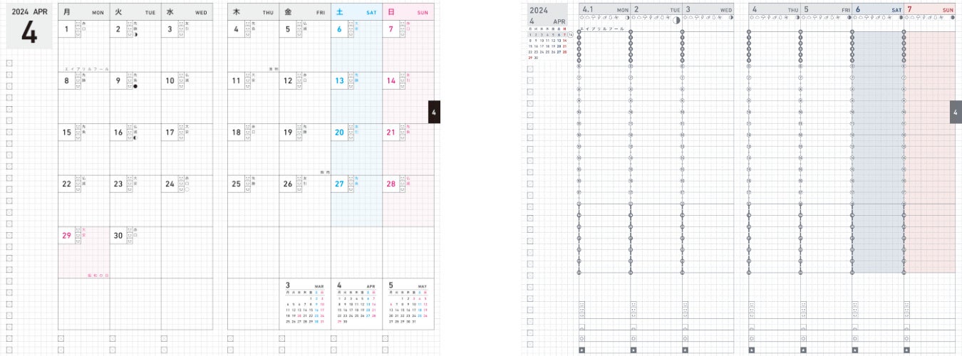 月の予定を一覧できる「月間ブロック」ページと、24時間軸を採用した「週間バーチカル」ページ。TODOリストやメモが書き込める、情報整理に役立つスペースも備わります。