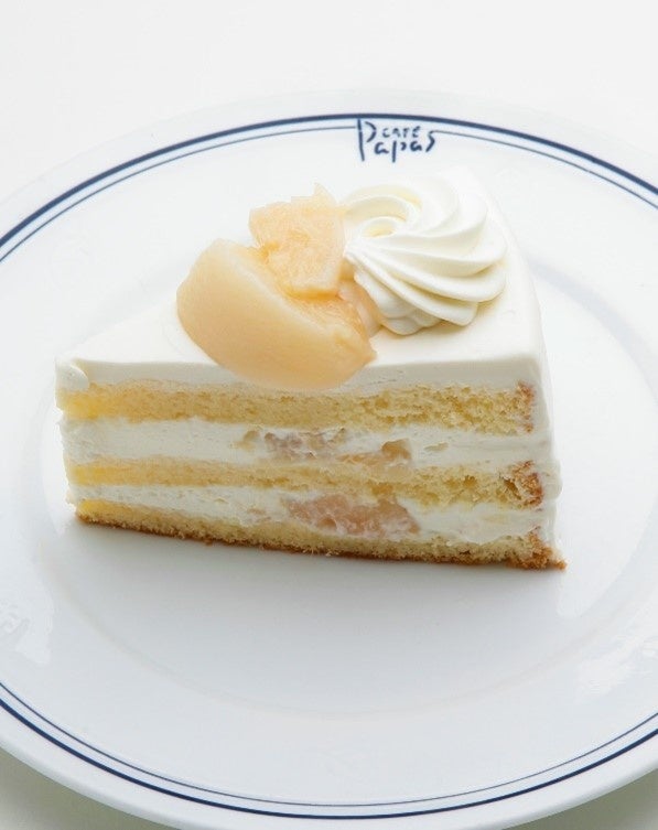 定番人気のショートケーキにミントが香る桃のコンポートをサンドしました。甘さひかえめなデザートです。