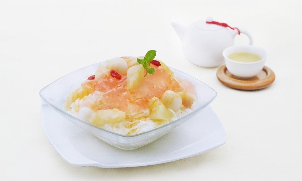 くちどけの良いふわふわとした台湾風のかき氷に桃のコンポートとジュレを合わせました。
