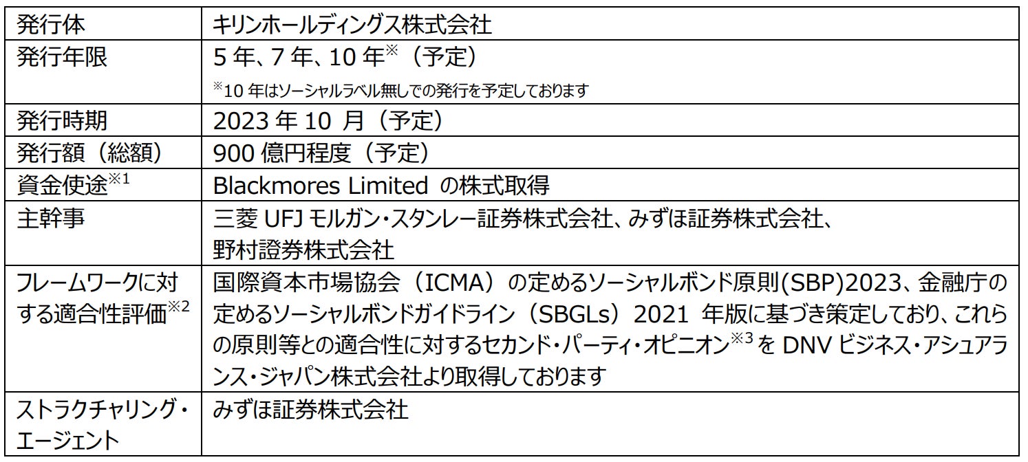 今回、当社は、キリングループの成長戦略および重点領域であるヘルスサイエンス領域に対する取り組みをステークホルダーの皆様に理解いただくための機会と捉え、Blackmoresの株式取得を適格プロジェクトとする「キリン・ソーシャルボンド・フレームワーク」を9月22日(金)に新たに策定し公表しました。本フレームワークは、国際資本市場協会(ICMA)の定めるソーシャルボンド原則(SBP)2023、金融庁の定めるソーシャルボンドガイドライン(SBGLs)2021年版に基づき策定しており、これらの原則等との適合性に対するセカンド・パーティ・オピニオン※3をDNVビジネス・アシュアランス・ジャパン株式会社より取得しています。