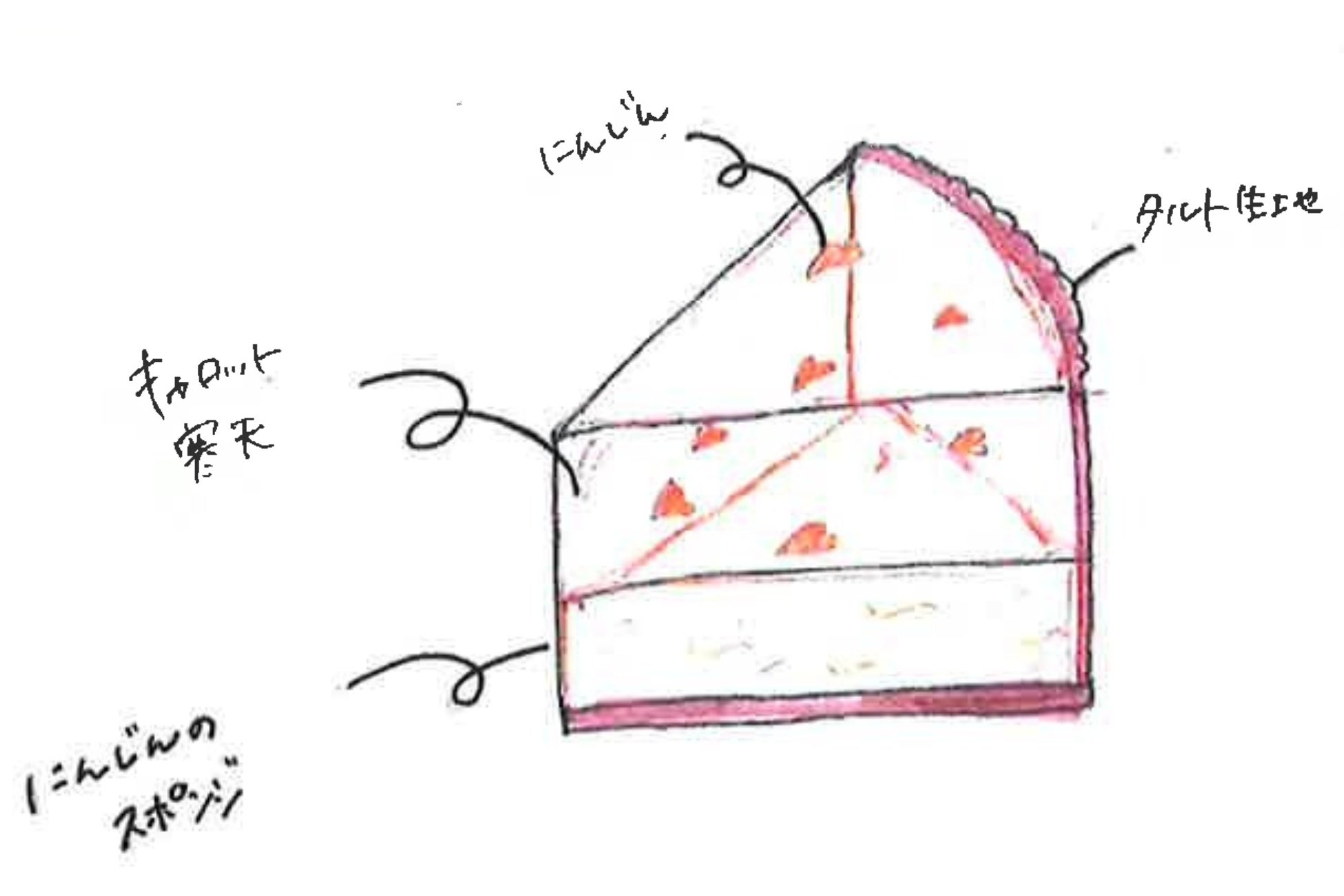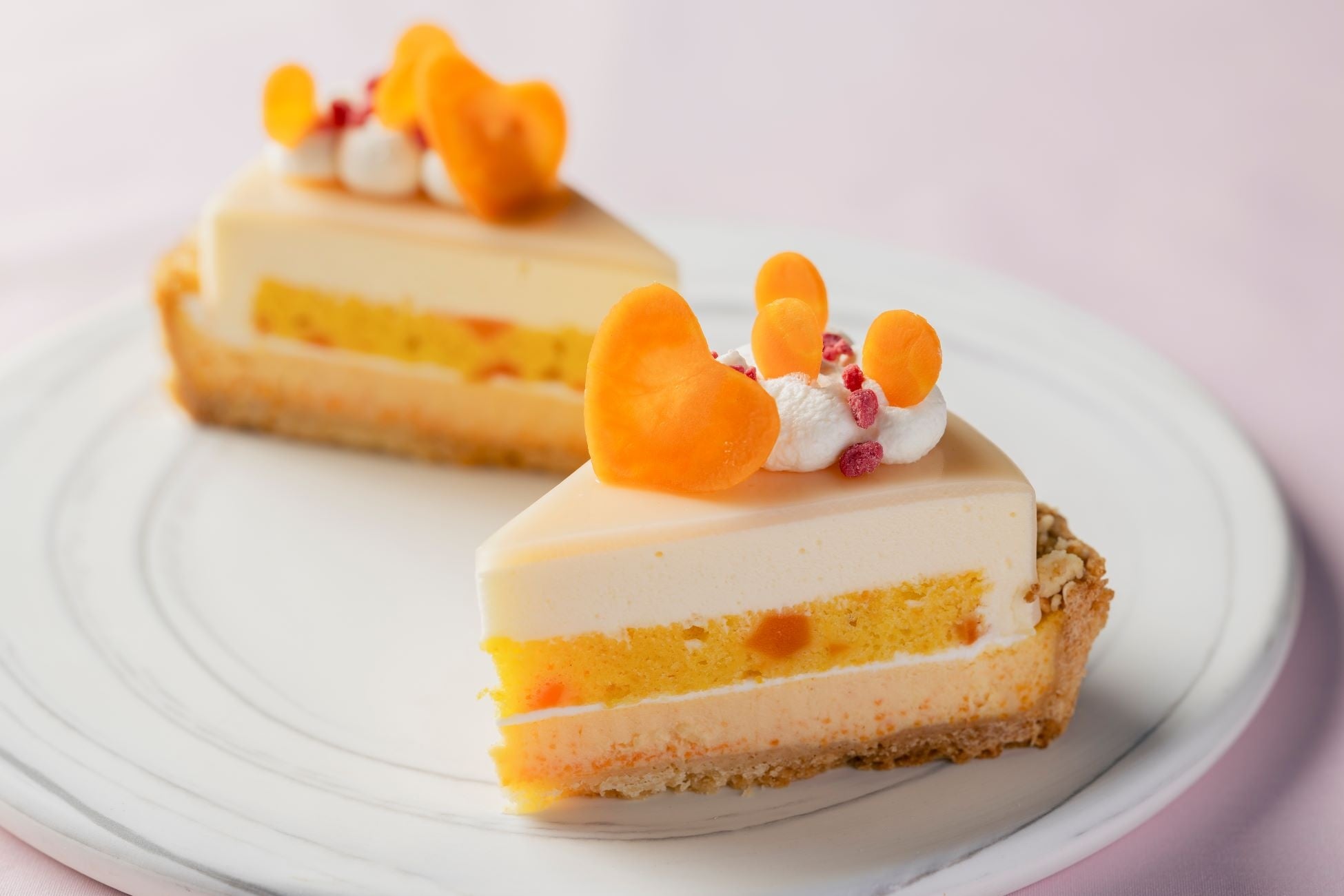 テーマのひとつである人参は、広島県福山市の「しもみん昆田農場」で収穫されるみ甘い「恋人参」を使用。すりおろした人参を混ぜ込んだチーズのタルトに、人参を練り込んだスポンジ生地を乗せ、甘いホワイトチョコレートのムースで覆いました。またハートにもこだわり、オレンジで風味づけした人参をハートの形にして上にトッピング。見た目も可愛く、人参が苦手なお子さまでも甘く食べやすいタルトに仕上げました。