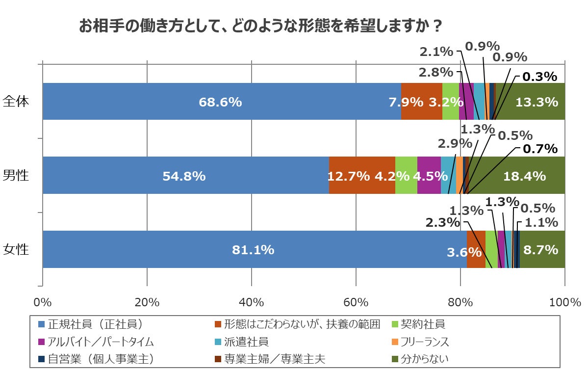 ・お相手も「正社員」希望は男性54.8%、女性81.1%、男女全体の68.6%と多数、「専業主婦」を望む男性は0.7%、「専業主夫」を望む女性は0.0%
