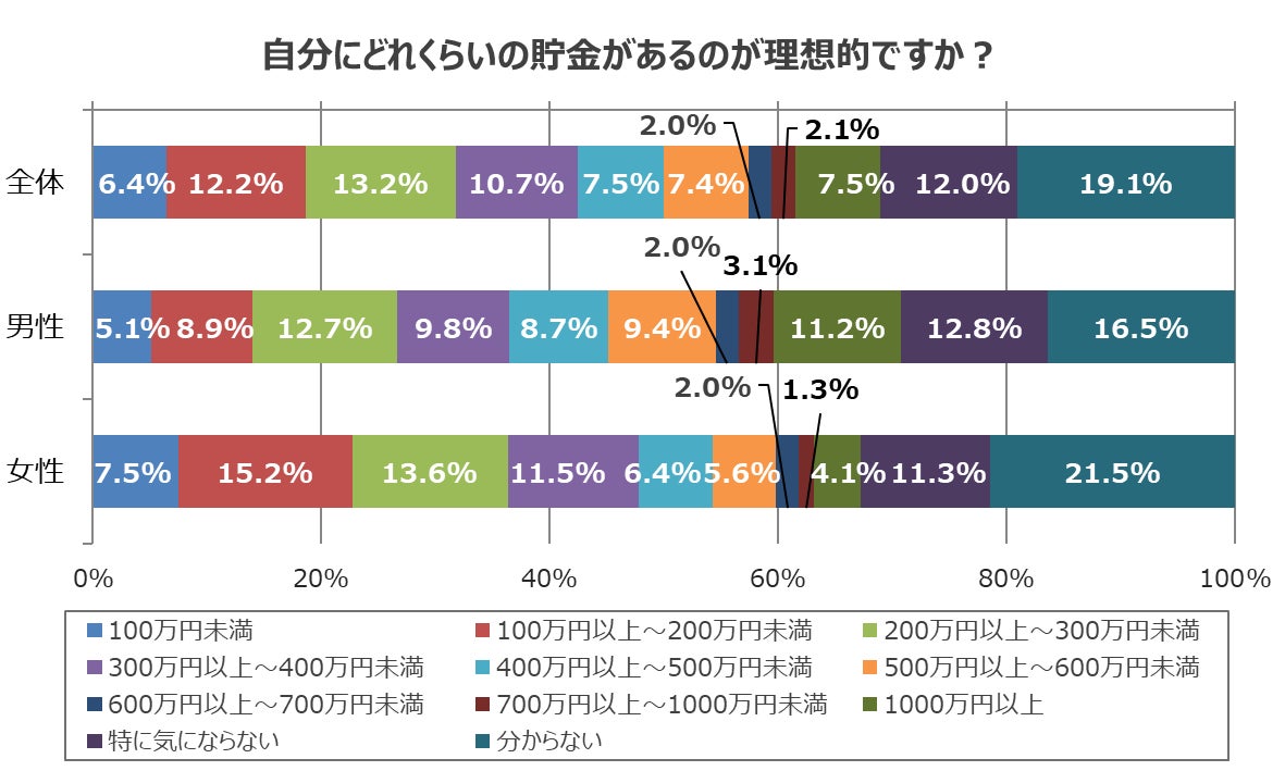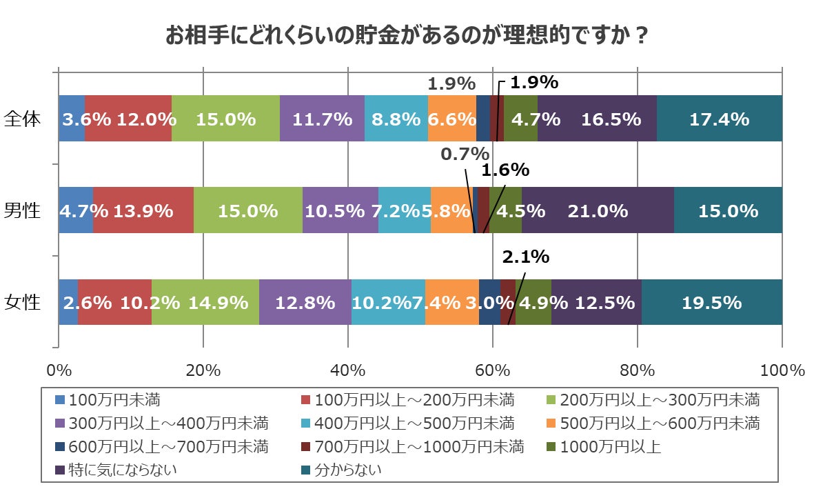 また、お相手の貯金については、「特に気にならない」(16.5%)が最も多く、次いで「200万円以上~300万円未満」(15.0%)、「100万円以上~200万円未満」(12.0%)となりました。自分の貯金については、「200万円以上~300万円未満」(13.2%)が最も多く、次いで「100万円以上~200万円未満」(12.2%)、「特に気にならない」(12.0%)となりました。