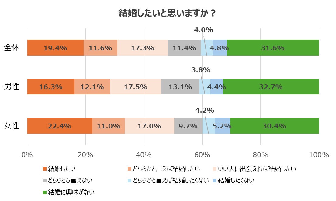20~35歳の未婚男女2,413人を対象に、結婚の意思について聞いたところ、「結婚したい」と回答した人は19.4%でした。「どちらかと言えば結婚したい」人は11.6%、「いい人に出会えれば結婚したい」人は17.3%で、平成生まれの未婚男女全体の48.3%の人が結婚したいと考えていることが分かりました。