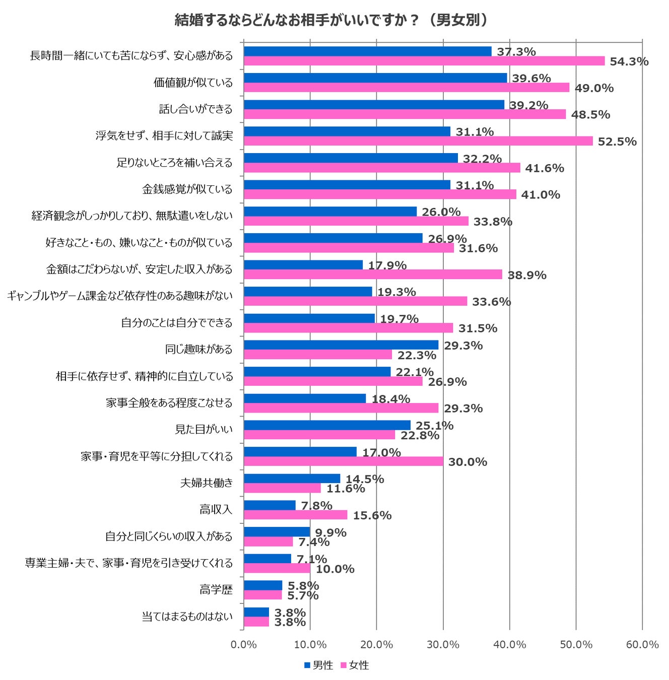 男女別に見てみると、男性は「価値観が似ている」(39.6%)が最も多く、次いで「話し合いができる」(39.2%)、「長時間一緒にいても苦にならず、安心感がある」(37.3%)となりました。これらの結果から、男性はパートナーと共有できる時間を求めている傾向が伺えます。また、「夫婦共働き」(14.5%)や「自分と同じくらいの収入がある」(9.9%)が女性よりも高い割合となっており、家庭における役割や経済的なパートナーシップを重視する男性も少なくないことがわかります。