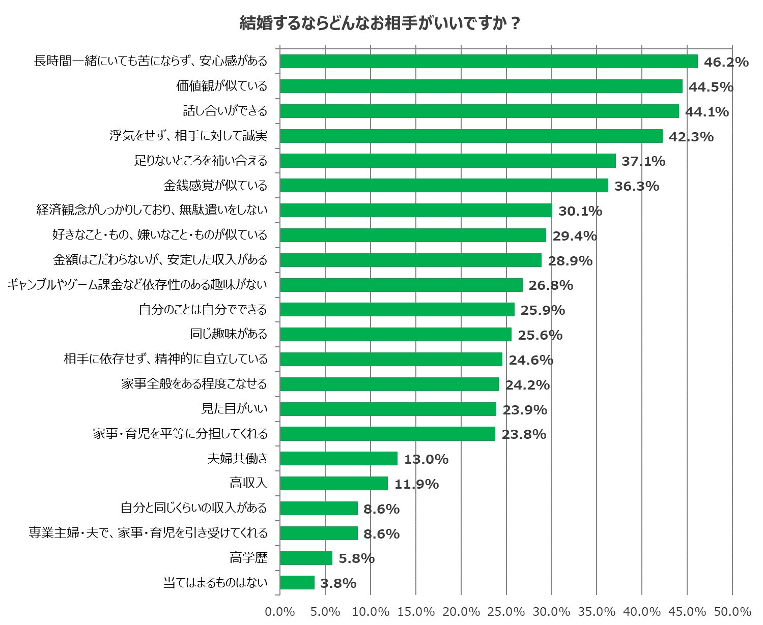 「対等に話し合える関係」(44.2%)と「安定した収入」(44.2%)が最も多く、次いで「価値観が同じ」(43.9%)、「お互いの意見・考えを尊重し合える関係」(42.5%)、「誠実で、浮気の心配がない」(41.4%)となりました。
