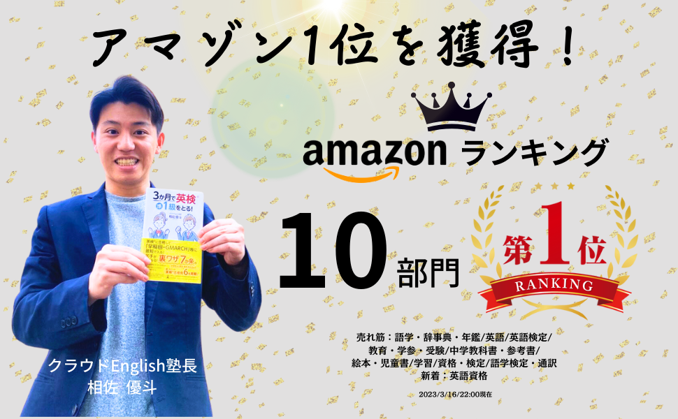 株式会社幻冬舎(本社:東京都渋谷区、代表:見城徹)が3月17日に発売した『3か月で英検準1級をとる!』(著:相佐優斗/クラウドEnglish代表)はこの度、Amazon10部門で1位、書店5店舗で総合1位の売り上げを達成しました。