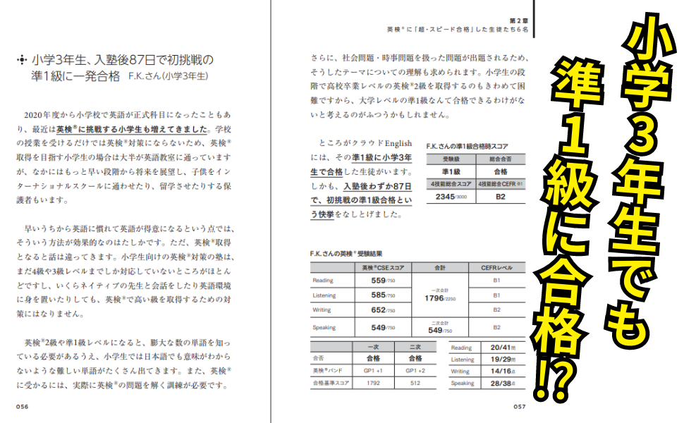 英語のテスト0点から3か月で準2級・2級に合格K.M.さん(中学3年生)/好きだった英語が苦手科目に――挫折を経て2級に一発合格 松本妃央さん(高校2年生)/落ちつづけた2級、初挑戦の準1級に2か月で合格 橋本駿さん(高校既卒生)/小学3年生、入塾後87日で初挑戦の準1級に一発合格F.K.さん(小学3年生)/3か月で準1級! 英検®と評定で早稲田に推薦合格C.I.さん(高校3年生)/英検®バンド「-6」から3か月で2級に余裕の合格Y.I.さん(中学3年生)