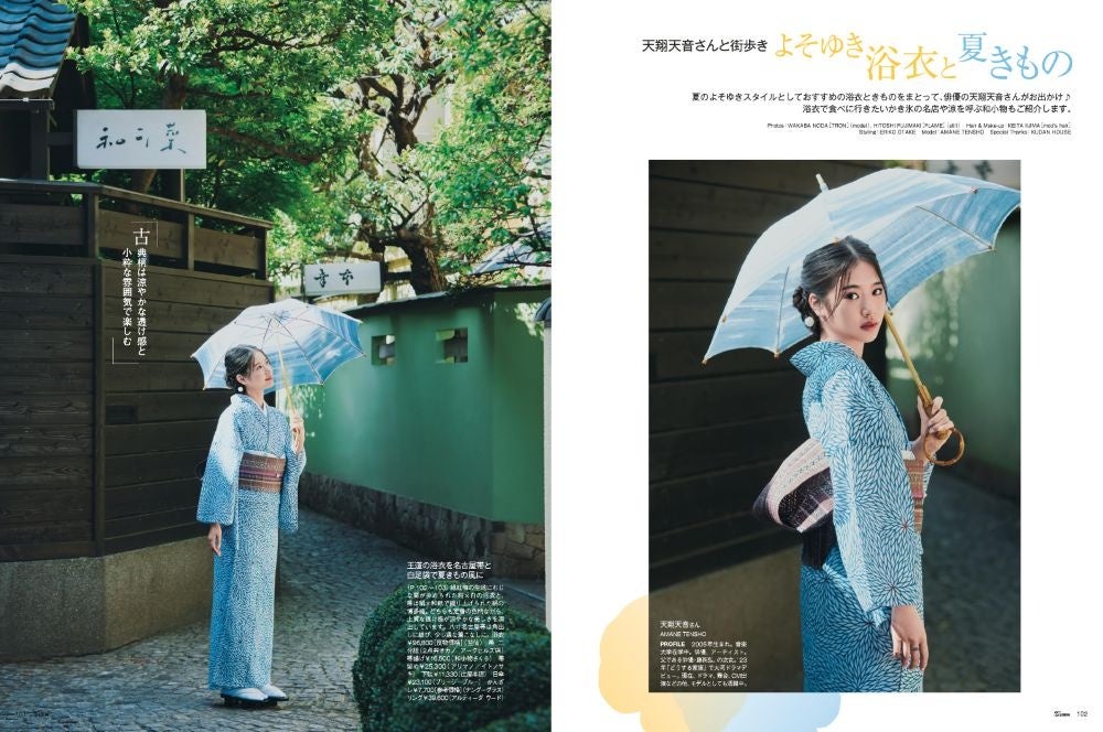 夏のよそゆきスタイルとしておすすめの浴衣ときものをまとって、俳優の天翔天音さんがお出かけ!浴衣で食べに行きたいかき氷の名店や涼を呼ぶ和小物もご紹介します。