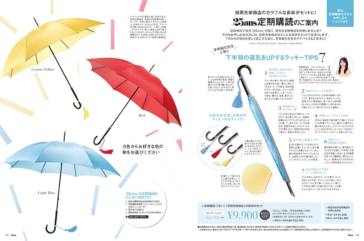 送料無料で毎月『25ans』が届く、便利な定期購読を利用しませんか?今お申し込みの方には、皇室の方々にも愛される「前原光榮商店」の長傘(¥14,300)がセットに。前回大好評だった長傘が軽量スリムタイプで登場です。色選びに迷ったら、風水師・李家幽竹先生のアドバイスをご参考に。美しい発色と光沢が魅力的な3色から、先着でお好きな色をお選びください。