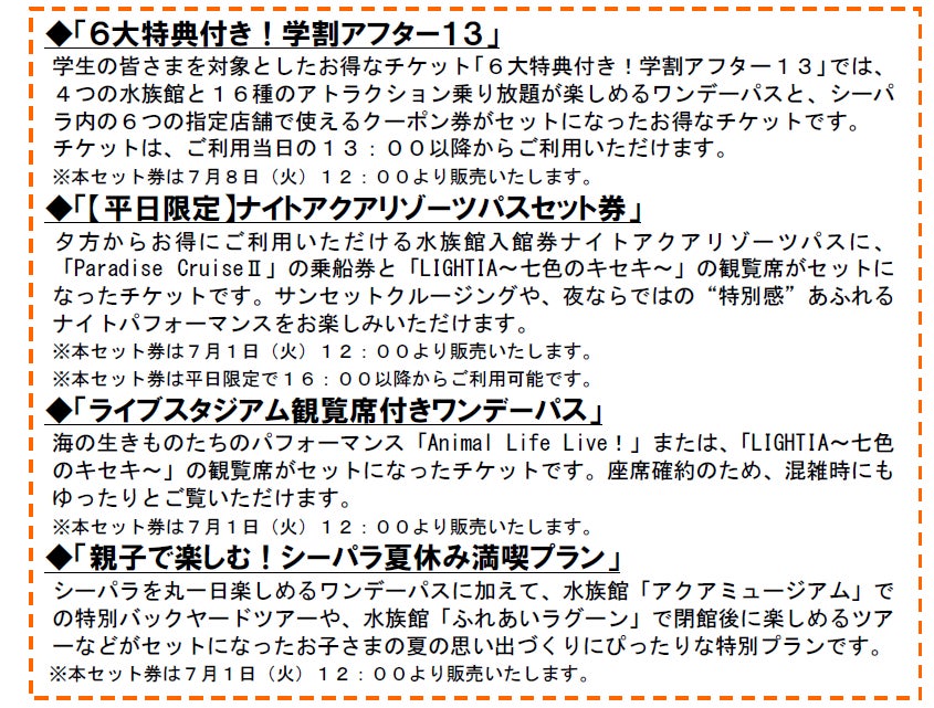 この夏シーパラを満喫できるさまざまなプランと、『横浜・八景島シーパラダイス』でご利用いただけるワンデーパス(水族館4施設パス+アトラクションフリーパス)などがセットになったチケットを横浜・八景島シーパラダイス公式ホームページで販売いたします。
