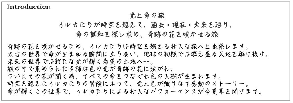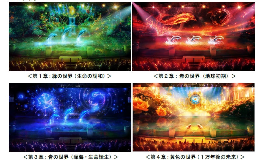 「LIGHTIA~七色のキセキ~」は、過去・現在・未来を旅し、生命の歴史・誕生・つながりを描きながら、命の調和と未来の希望につなぐ“奇跡の花”を咲かせるため、イルカたちが時空を超える壮大な物語を表現したパフォーマンスです。