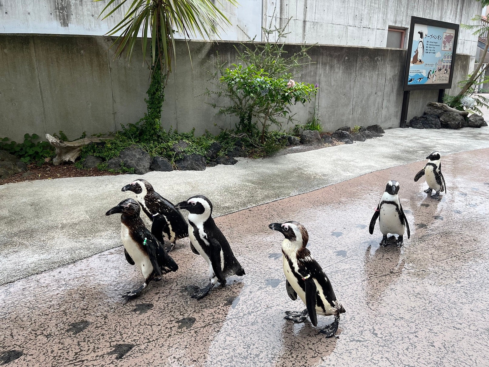 水族館「ふれあいラグーン」では、ぺたぺたよちよちと歩く姿が可愛らしいケープペンギンたちが、涼やかな水しぶきが舞う道をパレードいたします。ペンギンたちが一斉にぺたぺたと二足歩行で歩き回る可愛らしい姿は必見です。濡れた道を歩行するペンギンたちの足跡も見れるかもしれません。